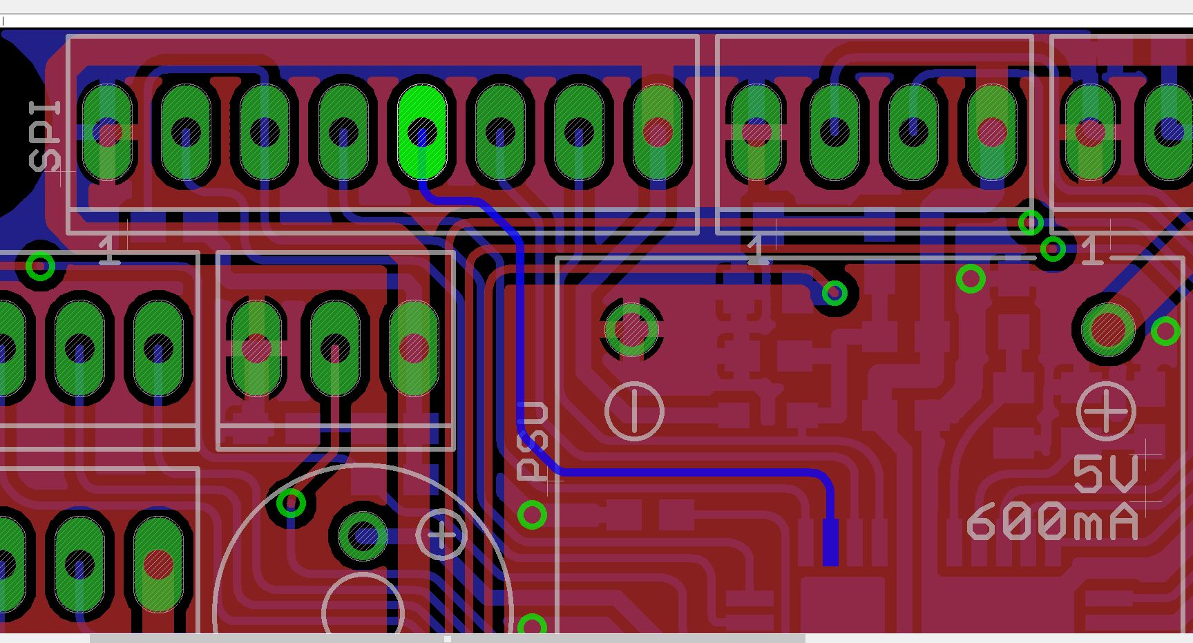 > Bau den Pullup mal spaßeshalber auf der displayseitigen Seite der Leitung ein Dort hatte ich es probiert. > ist die Versorgung displayseitig ordentlich abgeblockt um das zu verhindern? Das Display hat 10uF (keramisch) zwischen VCC und GND. Ich weiß aber, dass das sonst auch ohne geht, setze dieses Displays schon länger ein. > Wie lang ist die Leitung 30-40cm > wie dicht liegt die Reset-Leitung an den Datenleitungen? Auf der Platine nicht nenennswert, siehe Anhang (Reset/MISO hervorgehoben, ganz links GND, ganz rechts VCC, neben Reset MOSI und SCK, so wie sich das durch die MCU-Pin-Reihenfolge ergibt). Danach kommt ein loses Kabelbündel. > Wie liegt sie relativ zu den Versorgungsleitungen? Das könnte das Problem sein. Ich setze erstmals ein 600mA-Mini-Schaltnetzteil ein und habe damit 230V auf der Platine. Unter dem Schaltnetzteil soweit wie möglich eine durchgehende Massefläche auf dem Top-Layer. Signale überwiegend auf Bottom. Aber die OLED-SPI-Buchse liegt nur ~1cm daneben. > Zieht das Display kurze heftig gepulste Ströme aus der Versorgung Der Displaytest lässt es zwar ordentlich flackern (displayfüllende Animationen mit 10-20 FPS, schnelles Invertieren des ganzen Displays usw.), aber diese Displays sollen nicht mehr als 20-30mA brauchen. Das Netzteil liefert kurzzeitig auch 1A. Ich habe keinen externen Elko zur Pufferung dran (meines Wissens ist einer drin), aber heute versuchsweise mal 1000uF angeschlossen - ohne Effekt.