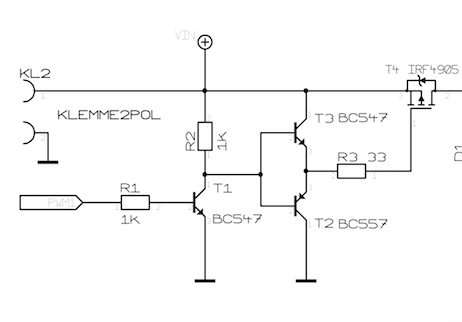 Ja, nimm bitte Relais. Das schließt aber dann nur einmal. Dass diese Kurzschlüsse namens Q4 und Q6 nur sehr begrenzt Sinn machen wurde immer noch nicht oft genug gesagt, oder? Was soll die Aufgabe dieser Transistoren sein? Q4 kann theoretisch die Ladespannung des Bleiakkus begrenzen, allerdings unter Wärmeentwicklung und der ständigen Gefahr bei falscher Ansteuerung nen lauten Knall zu hören. Q6 genau das gleiche, aber mit dem Vorteil das die Spule wenigstens noch den Stromanstieg begrenzt. Beitrag "Re: Mostet mit 3,3V schalten (Raspberry Pi)" Die Ströme I1 und I2 sind dick rot eingezeichnet. Diese Ströme werden vor allem bei einem Bleiakku SEHR GROß und können sowohl FET als auch Relais in kürzester Zeit zerstören. Was du brauchst, ist: - PV Modul (bei 15V optional: MPPT) - Ladereglerschaltung für den Bleiakku (in diesem Fall mit Strommessung) - Display und Gedöns. Die MC34063 Schaltungen kannste komplett in die Tonne kloppen. Die rechte versorgt gar nix, die linke scheinbar auch nicht weil du sagst ja der RPi hat ein eigenes Netzteil (warum eigentlich?). Das sind übrigens beides Step-Up Wandler und wofür du Spannungen größer als 12V brauchst ist unklar. Zur Ladeschaltung: Du hängst zwischen PV Modul und Bleiakku einen p-Channel Mosfet. Den ziehst du per Pull-Up auf 12V. Per NPN Transistor lässt der sich auf low ziehen, was bedeutet dass er leitet. Damit kannst du die Ladung des Akkus beenden, wenn er voll ist. Mit sowas hier: http://www.ebay.de/itm/INA219-I2C-Bi-directional-DC-Current-Power-Supply-Sensor-Module-for-Arduino-/291625895790?hash=item43e642076e:g:rjgAAOSwLN5WhIRw kann man Strom und Spannung des Bleiakkus messen. Strom mal Spannung ergibt Leistung. Wie du I2C am Rpi verwendest, weiss ich nicht. Aber das geht nicht nur mit Hardware I2C Interface sondern auch bitbang mittels GPIO Pins und Software. I2C Bibliothek von Peter Fleury kann auch helfen, die kann auch Software I2C Kommunikation. So, und jetzt hast du deine Leistung, und die kannst du dann aufm Display ausgeben.