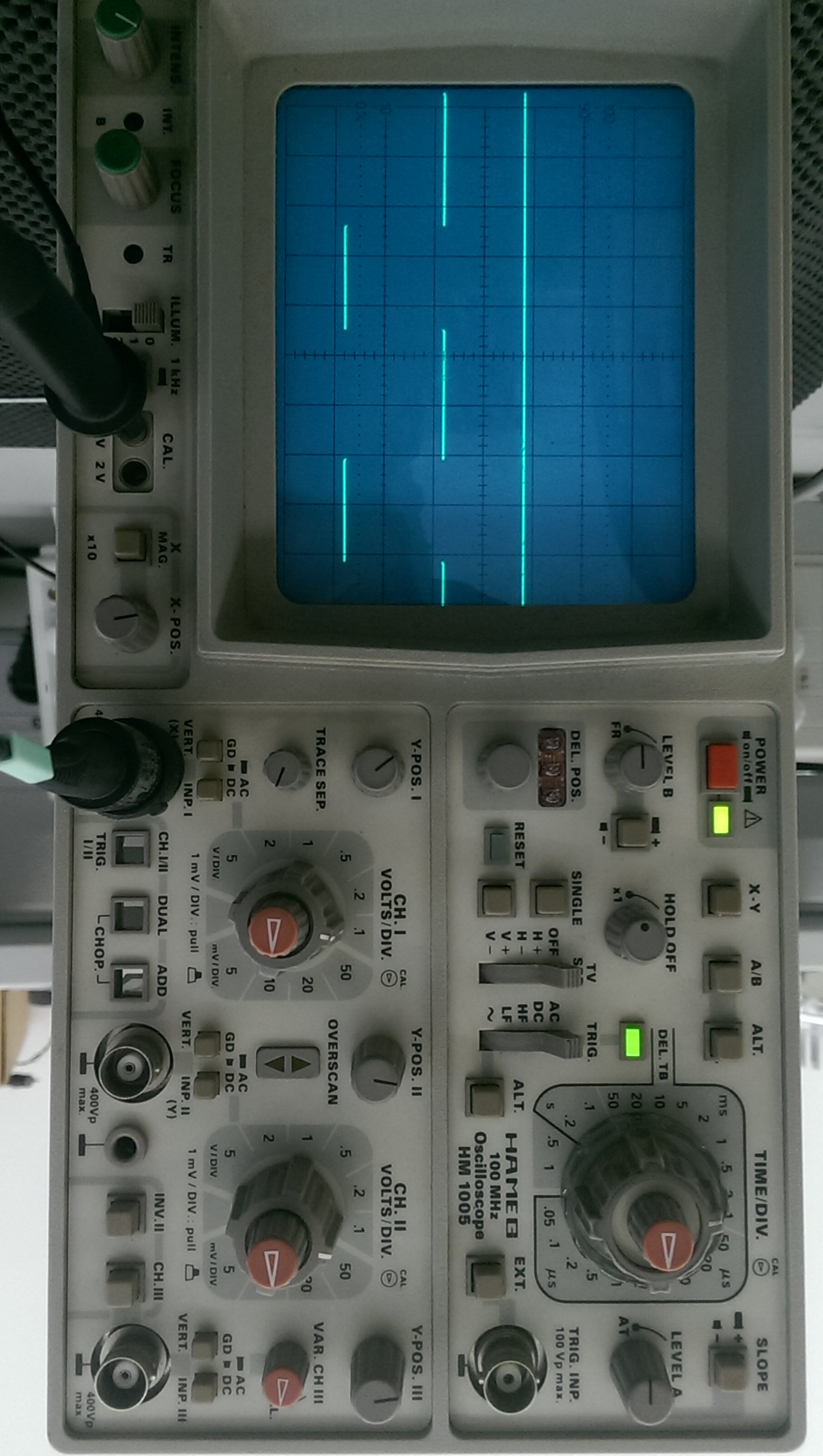 Hallo, im Moment versuche ich ein erstandendes Ozsillskop für den Eigengebrauch zu reparieren. Anfangs war auf dem Bildschirm überhaupt kein Bild. Nachdem einige Stellen neu gelötet und lockere Kabel befestigt wurden, kann ich auf allen drei Kanälen ein Rechtecksignal auf dem Bildschirm empfangen. Mein Problem ist jetzt, dass ich auf dem Bildschirm eine permanente horizontale Linie erscheint, die wahrscheinlich mit dem dritten Kanal zusammenhängt. Wenn ein Signal oder kein Signal auf den dritten Kanal anliegt, kann ich die y-Position beliebig verstellen. Bei Unterbrechung der Verbindung zwischen Pre-Amplifier und Intermediate Amplifier, sollte kein horizontaler Strahl, außer von Kanal 1. bzw. 2, zu sehen sein. Stattdessen befindet der der horizontaler Strahl auf einem festen y-Wert, der unabhängig von der vorherigen eingestellten y-Position ist. Die drei fehlenden Knöpfe habe ich ausgebaut und können von Innen betätigt werden.