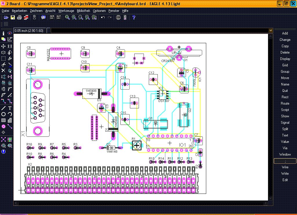 Hallo, habe mit Eagle erst vor kurzer Zeit angefangen und jetzt wollte ich eine Platine erstellen und auf dem Board was als gif datei beigefügt zeigt mir nicht alle verbindungen unter den Bauteilen an.Obwohl ich alle verbindungen im Schaltplan esrtellt habe.Die Platine soll 2 Seitig sein. Vielleicht kann mir jemand helfen. Gruß Snipple