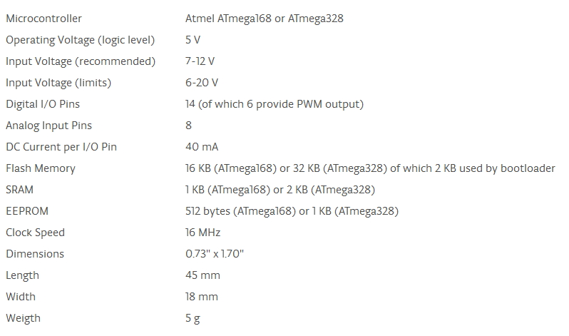 https://www.arduino.cc/en/Main/ArduinoBoardNano Beachte: Die Angaben gelten nur fuer "echte" Arduino Nanos. China Nanos verwenden zu 99% Fake Spannungsregler des Typs AMS1117. Diese China AMS gehen nur bis 12V und sind zudem (nach meinen Efahrungen) nicht kurzschlussfest.Wenn man also damit experimentiert und mal einen kleineren Kurzschluss verursacht ist das Nano-Modul bei 12V Eingangsspannung hinueber....