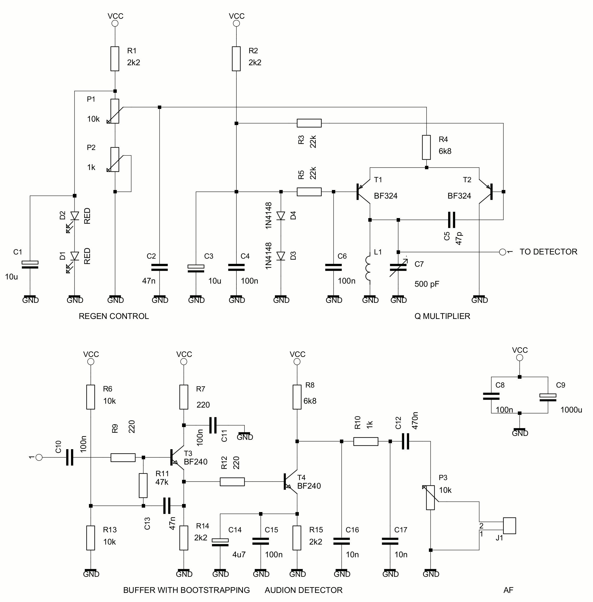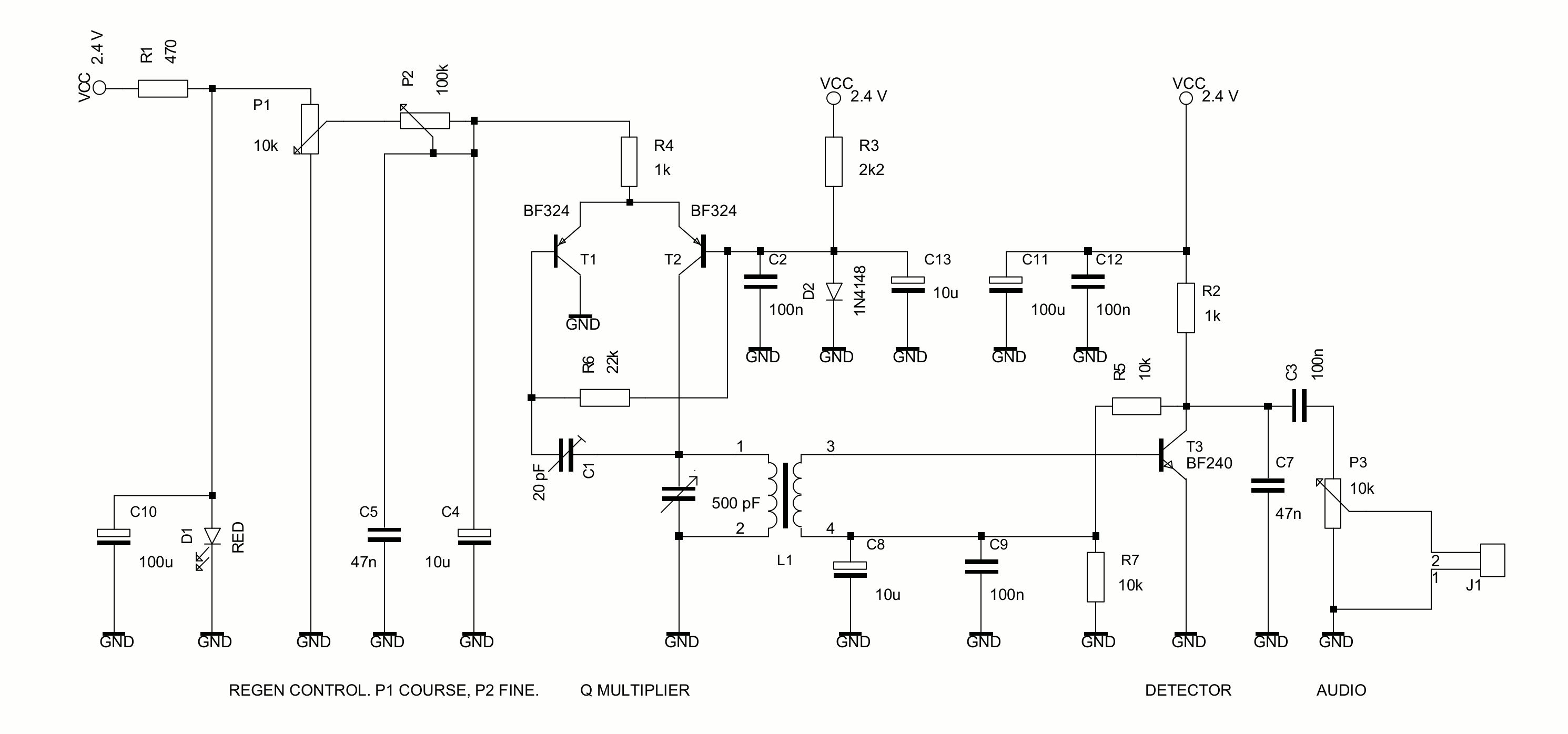 Hier gibt es ein Schaltplan des Versatile Regen Audions. Er hat ein Entdämpfungsglied mit einem differenz-verstärker und ein Audion mit einem Bipolaren Transistor. Einen ausfürlichen Beitrag dieses Audions von mir findet man auf http://theradioboard.com/rb/viewtopic.php?f=4&t=6859 (Versatile Regen with an emitter coupled oscillator).
