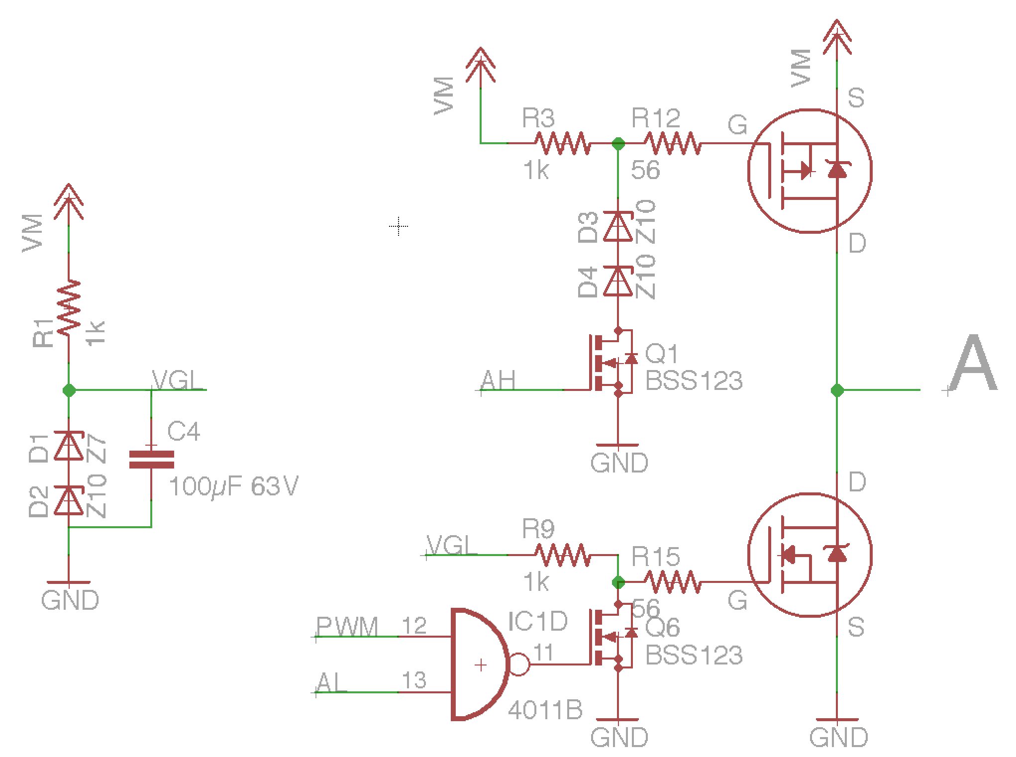 Da hast du völlig recht. Die Interesse besteht nur leider habe ich sehr wenig Erfahrung auf diesem Gebiet. Kann mir jemand nochmal genauer erklären was ich tun soll damit die FETs schneller angesteuert werden? Soweit ich das verstanden habe muss ich für jeden P-FET (und N?) die Widerstände R3 und R4 von 10k auf ca. 1k oder geringer austauschen damit genug Strom zum ansteuern geliefert wird. Des Weiteren kann der Widerstand mit den 56ohm ausgelötet und überbrückt werden da dieser sowieso nicht nötig ist. eine Z-Diode soll ich wo einfügen? Zwischen den Ausgang von den bs123 und dem Signaleingang (Gate??) damit die Spannung limitiert wird? Die Z-Diode auch nur mit vorgeschalteten widerstand betreiben? Sehe ich das richtig? Und wenn die Schaltung dann so aufgebaut ist, sollten die FETs etwas kühler laufen? Mir geht es jetzt in diesem Moment garnicht darum das die Schaltung "Kalt" ist, nur möchte ich eben nicht nach 10 Sekunden langsamen Motor laufen die FETs grillen. Ich habe auch 2 4mm Aluminium Bleche gefräst damit die Wärme etwas abgeleitet werden kann. Nochmal Danke für die tatkräftige Hilfe!!
