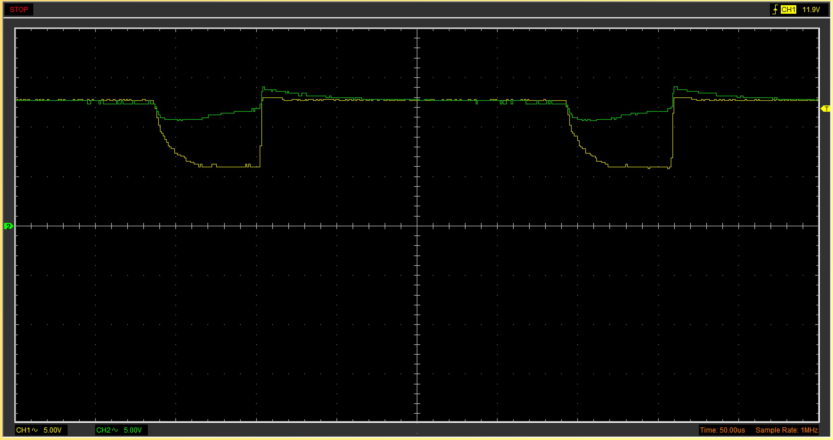 Hallo Leute, bevor ich an dem Code etwas verändern wollte, habe ich einfach mal mit dem Oszi geprüft wie die ausgänge aktuell von dem Controller sind. Ich habe dann das Oszi an HA und LA gehangen und habe festgestellt das aktuell schon eine Dead Time läuft! Ein Bild habe ich hinzugefügt. Leider gehen nun P und N Fet kaputt wenn ich mehrere Minuten unter Last fahre. An einer Platine sind auch die Kleinen BSS123 durchgegrillt. An was kann das liegen?