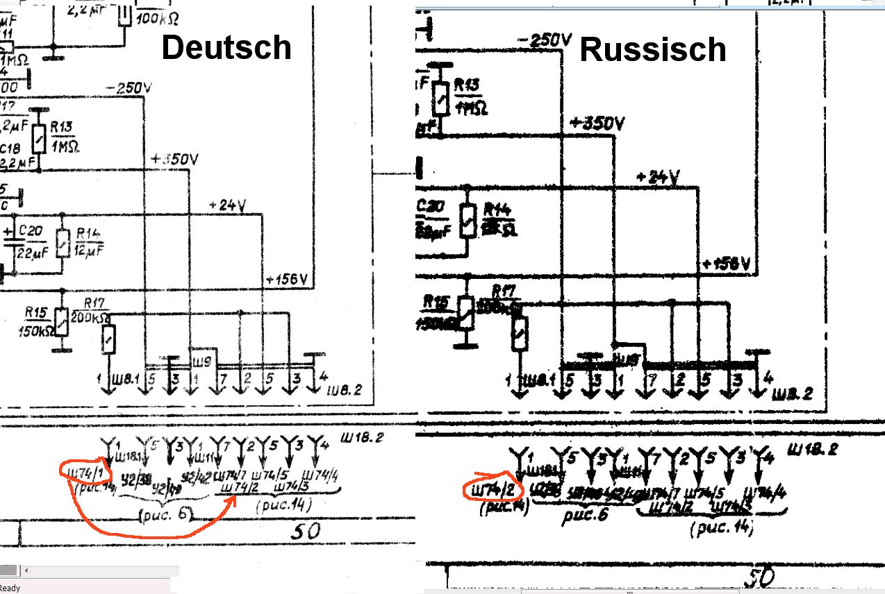 So, heute Zeit gehabt- Messungen und Vergleiche gemacht. Unglaublich- die Russen geben für ihre Verbindungs- Flachband- Kabel im Handbuch blaue Drahtfarbe an Kontakt 1 vor. An EINER Steckverbindung (Scha9 zu Stecker Scha11) des Netzteils ist das Potential aber positiv ! Immerhin beachtliche 350 V Bei Steckung nach Handbuch wird die Spannung +350 V mit einer Spannung -250 V vertauscht ! Ich habe das vom Netzteil zur Verbindungsplatte verfolgt- die Steckverbindung ist bei meinem Gerät am Netzteil tatsächlich andersherumm zur im Handbuch vorgegebenen Steckweise zu stecken. Merkwürdig: In BEIDEN Handbüchern ist das so gezeichnet. Und- auch die Pinnummern suggerieren eine Verbindung Pin 1 zu Pin 1. (Die anderen beiden Nummern sind nicht 3 und 5, sondern 2 und 3, dies ist aber nur eine Zählweise wegen der weiter auseinanderliegenden Pins der Steckverbindung). Da bin ich mit der Fehlersuche nun ein Stück weiter, zumindest bei einem Oszi. Die Beschaltung der Verbindungsvorrichtung ist zum Teil mit Leiterzügen realisiert, zum Teil mit Draht. Bei den anderen Oszis war tatsächlich 1 zu 1 verbunden- also müßte das Netzteil negatives Potentiel auf 1 ausgeben- das ist aber unwahrscheinlich, dies erfordert euine andere Leiterplatte- wahrscheinlich ist die Verbindungsvorrichtung anders beschaltet- allerdings ist auch in diesem Falle die Bezeichnungsweise gefährlich, weil Kontakt 1/ blau auf jeden Fall an + 350 V liegt. So extreme Schaltplanfehler... das ist der blanke Horror. Meines Wissends hat auch niemand andere Unterlagen, als die recht umfangreichen Handbücher. Diese sind allerdings keine echten Service- Unterlagen, es fehlen z. B. Leiterplatten- Layoutbilder und Oszillogramme, die Spannungsangaben sind spärlich- aber dermaßen krasse Fehler geben zu denken- wenn man alle Flachbandkabel abzieht, und nicht die korrekte Einbauweise festgehalten hat, und später nach der Handbuch- Vorschrift wieder zusammenbaut, ist wenigstens die Nichtfunktion vorprogrammiert. Übrigens ist schon bei den Netzteilen die 12- polige "Steckdose" für die Verbindung zum doppelpoligen Einschalter anders beschaltet, obwohl die Netzteile sonst identisch sind- das ist aber eher ein harmloser Fehler.