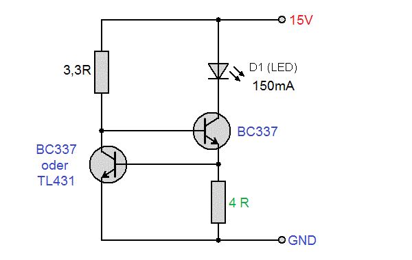 Also die 4 Ohm Emitterwiderstand sind schon Ok für nen Bipolar-Transistor. Der TL431 regelt auf 2,5 V. Da müsste man auf 16,6 Ohm erhöhen (2x 33 Ohm parallel.) Der Basiswiderstand ist viel zu klein. Hier würde sich was zwischen 1k und max. 6k anbieten. Der BC337 ist mit einer Sromverstärkung von min. 60 spezifiziert bei einer U_CE von 1 V und I_C = <= 300 mA. Nein, er wird nicht in Sättigung betrieben sondern nimmt exakt die Differenzspannung auf von Dioden-Vorwärtsspannung U_F (bei weißen LEDs typ. 4 V) und Spannungsabfall über dem Emitterwiderstand. Hier arbeitet der Lasttransistor mit einer U_CE von etwa 2,3 V und setzt bei 150 mA Kollektorstrom etwa 350 mW um. Damit erwärmt sich die Sperrschicht um ca. 70 K über die Umgebungstemperatur und du darfst ihn bis zu einer Umgebungstemperatur von max. 75°C betreiben.