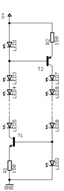 Der linke T2 kann nicht sättigen. Der Rest sieht in Ordnung aus, du schaltest aber 3-4 LEDs in Reihe, oder? Sonst sieht die Leistungsbilanz an T1 ungünstig aus. Eine LED allein mit 3,2V: P = U*I = (15-3,2-0,7)*0,15A = 1,67W. Für nen kleinen TO92 Transistor schon zu viel. Bei 3 LEDs sinds 0,7W, das geht dann wieder. Für 4 LEDs dürfen die bei vollem Strom nur etwa 3,3-3,4V Flussspannung haben. Kann man mal ausprobieren, ist aber dann nicht mehr viel Spielraum übrig bei sinkender Versorgungsspannung.