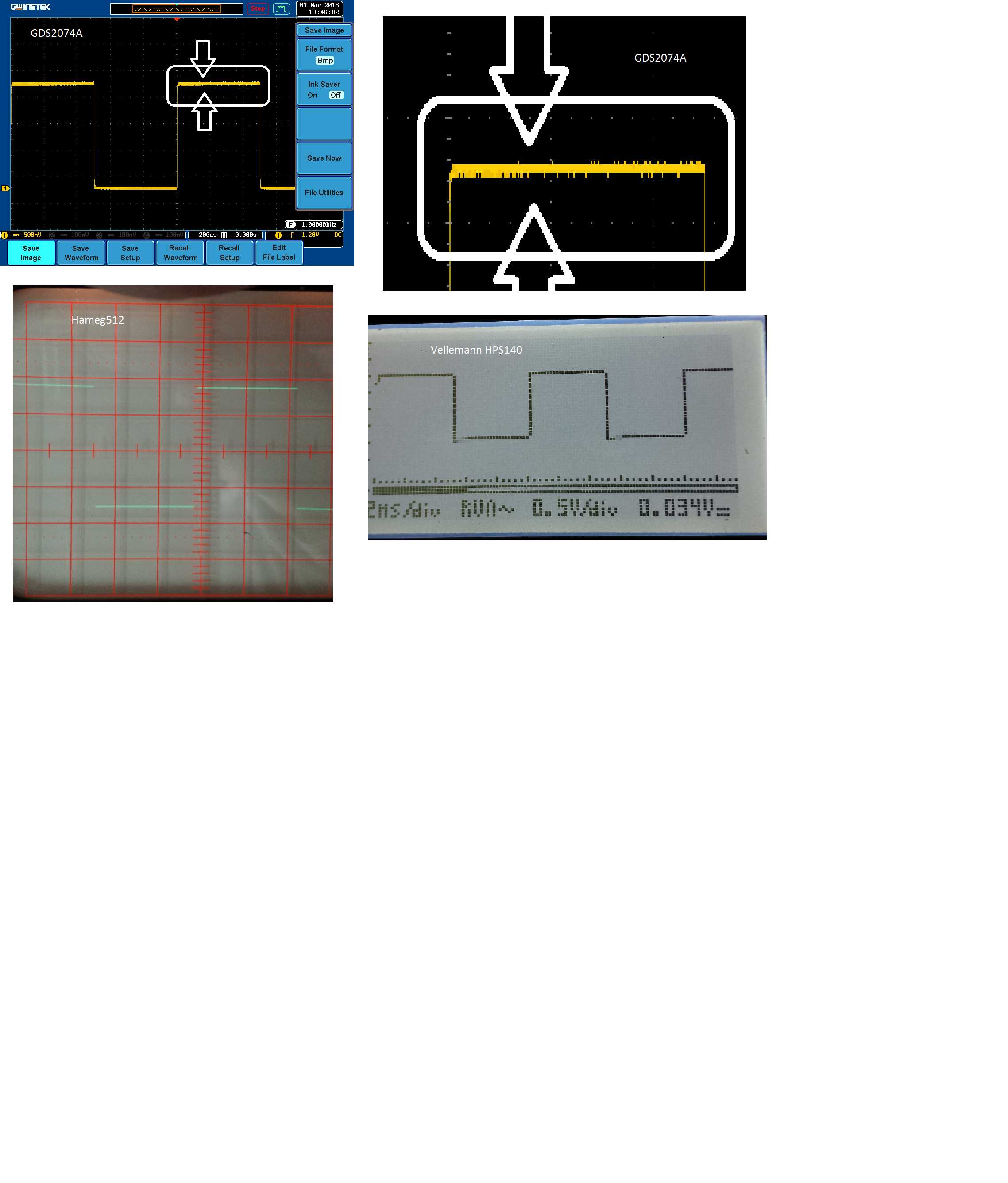 Hi. Sehe auf meinem neuen GW-Instek GDS2074A merkwürdige Störpegel auf Signalen angezeigt - siehe Foto mit Oszi-eigenem Referenzsignal links/rechts oben. Dieser Störpegel ist weder auf einem anderen DSO (Vellemann HPS140) noch auf einem alten analogen Scope Hameg512 zu sehen. Gleiches passiert auch mit externen Signalen jeglicher Amplitude. Der Verkäufer des GDS2074A behauptet, das sei "normal" und aufgrund der 8-bit-Auflösung bedingt - aber wenn die Vergleichsscopes das Signal sauber darstellen, denke ich eher an eine Macke des Gerätes. Ich wäre sehr dankbar, wenn die angehängten Fotos jemand mit Erfahrungen zu DSOs bewerten könnte - ich selbst bin Neuling bei DSOs. Danke !