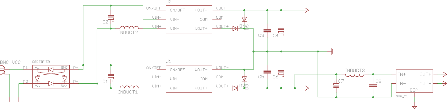 @Joe Ich kann nur sagen, dass die Dioden dort hingehören. Bei TracoPower habe ich angerufen, die haben mir eine Zeichnung (mit den Dioden) geschickt, wie man zwei Wandler "addiert". Den gleichen Aufbau habe ich hier wiedergefunden (mit plausibler Begründung für die Dioden): http://cdn.vicorpower.com/documents/application_notes/an1_high-vout.pdf und einen ähnlichen Aufbau hier: http://www.aimtec.com/site/Aimtec/files/documents/ApplicationNotes/connecting%20converters%20in%20series.pdf @Hubert Danke für den Hinweis, ich probier es gleich mal aus.