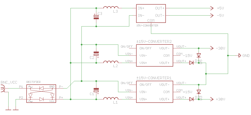 Hallo, ich habe einen OPV (nennen wir ihn OPV2), den ich mit ±30V versorgen muss. Das funktioniert aber nur, wenn ich zwei ±15V-Spannungsregler zusammenschalte. Der Hersteller der Spannungsregler (Traco) hat das abgesegnet und mir erklärt, wie man das macht. Dann möchte ich in den OPV2 ein Signal einspeisen, was zuvor durch einen anderen (zum Filter verschalteten) OPV1 ging, welcher mit ±5V versorgt wird. Dazu ist es notwendig, dass beide OPVs gleiche Masse besitzen. Das ging bisher auch, weil ich einen ±24V- und einen ±5V-Spannungsregler hatte, deren Common-Ground-Pins ich zusammengeschlossen habe. Da nun durch das Konstruieren der neuen ±30V-Spannungsquelle der Common-Ground-Pegel ganz woanders liegt (so vermute ich zumindest), kann ich diesen nicht mehr dem Common Ground des ±5V-Reglers zusammenlegen. Daher möchte ich den ±5V-Regler nun durch die konstruiere ±30V-Quelle speisen. Geht das so, wie ich das in der Zeichnung dargestellt habe oder kann ich gar doch beide Common Grounds (der ±30V- und der ±5V-Quelle) zusammenlegen? Eigentlich sind sie ja von der "Einspeise-Masse" isoliert. Grüße und Danke Peter