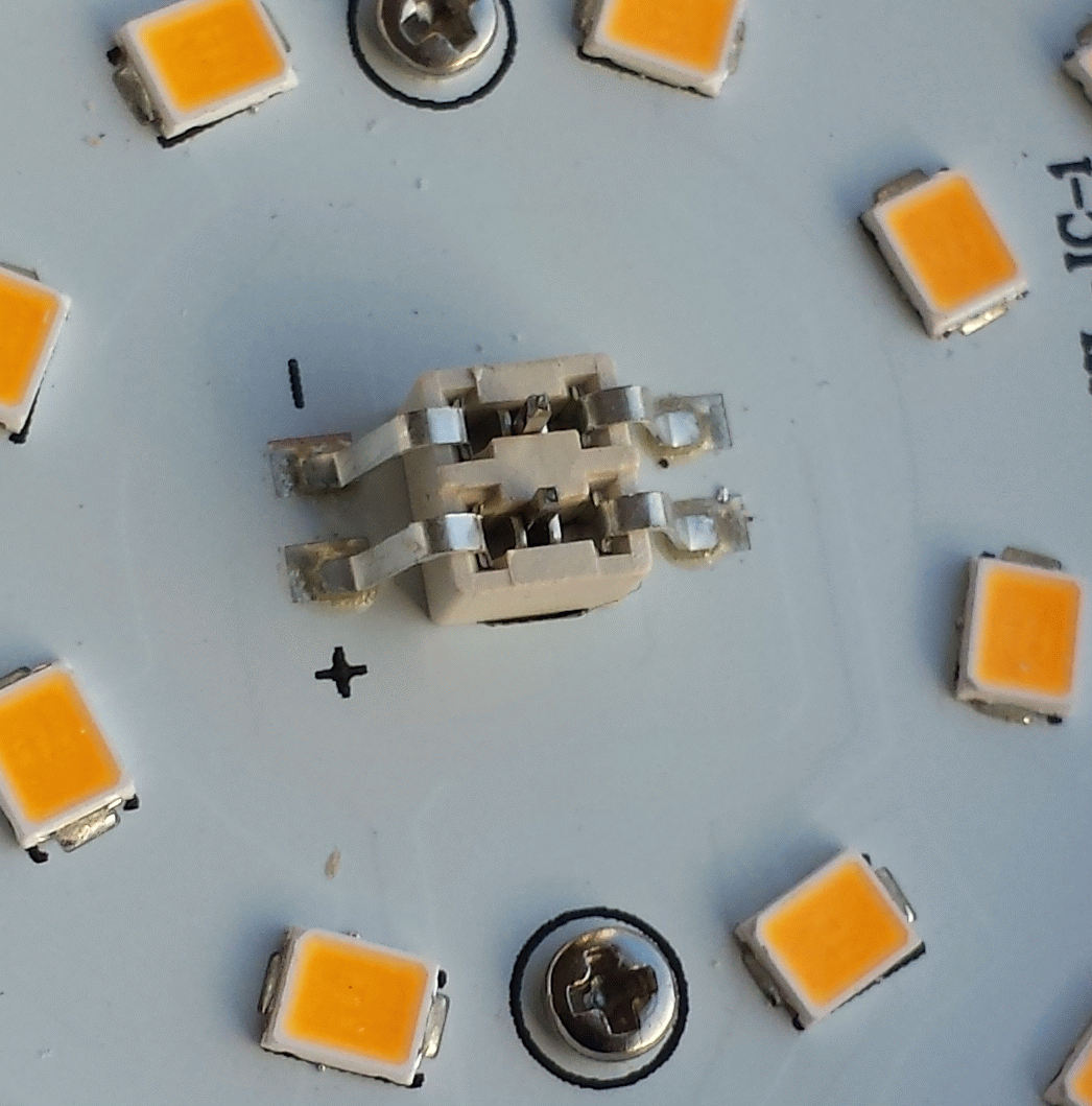 Hallo, bei einer geöffneten "Voltolux"-LED-Lampe (Bauhaus, 230V, 15W, 1520Lumen) ist in der Mitte ein ungewöhnliches Bauteil zu sehen. Was ist das ? Thermosicherung? Gleichrichter?? PS: Wie "üblich" wird bei Dauerbetrieb der Sockel sehr heiß. Wie heiß die LEDs dann werden, kann ich nur raten...