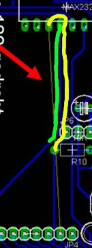 SO, hier ein Layout, welches klappt: Die Leitung vom Sub-D Stecker Pin2, die von oben links nach unten unter dem uC, unter dem Quarz und dann wieder hoch zu dem Max geht, wird entfernt. Anstelle dessen routest Du den direkten Weg (grüne Linie), die kreuzenden Leiterbahnen überbrückst Du mit einer Drahtbrücke (graue Linie) Die gelbgrüne Linie entspricht der ungerouteten und geht direkt runter auf den Pin. Nicht wirklich schön, aber sollte klappen. cu z0ttel