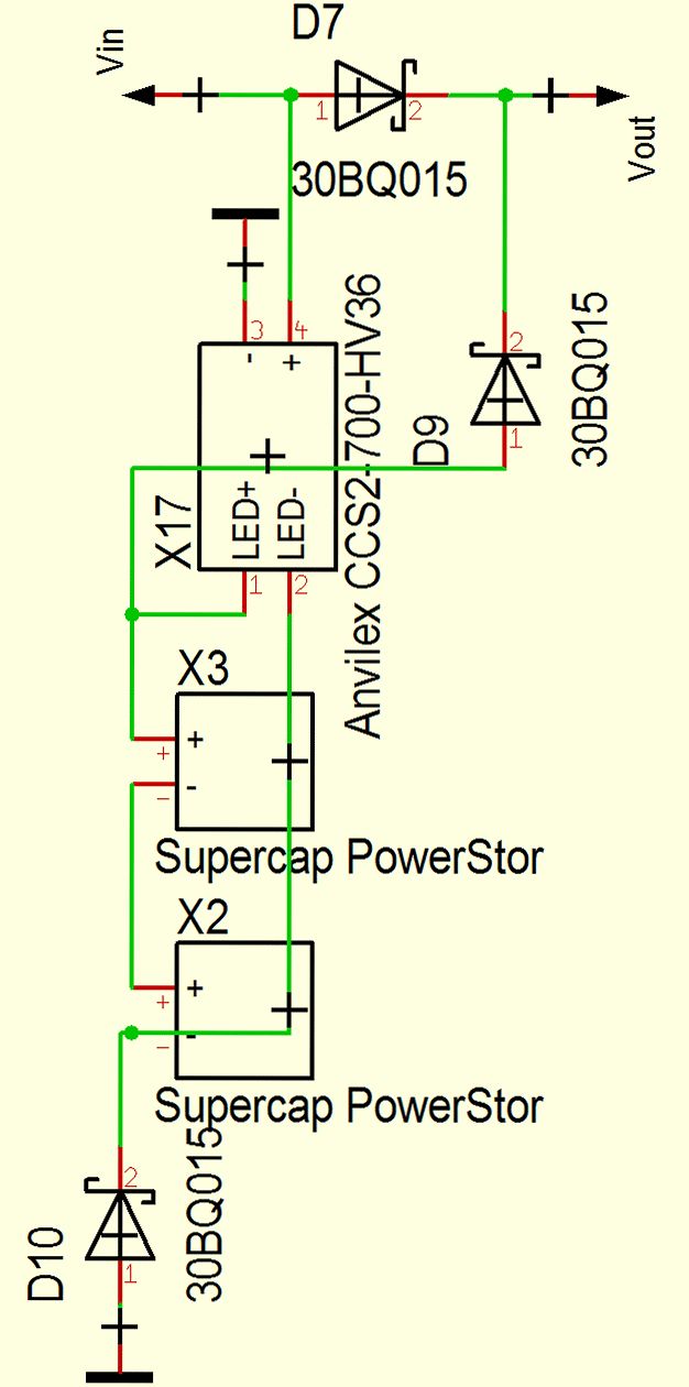 Hallo Michael, ohne D10 am Minuspol funktioniert deine Schaltung. Ich gehe davon aus, dass die Supercaps in Reihe geschaltet sind, damit sie nicht über ihre Nennspannung aufgeladen werden. Du solltest nur noch Maßnahmen treffen, dass die beiden Supercaps symmetrisch geladen werden. Die Dinger haben hohe Toleranzen was die Kapazität angeht und laden sich entsprechend auf verschiedene Spannungen auf, d.h. noch einen hochohmigen Spannungsteiler parallelschalten, mit dem Mittelpunkt an den Verbindungspunkt der Caps. Das verringert den Wirkungsgrad jedoch permanent und die "Symmetrierung" ist Dimensionierungssache. Alternativ kannst du auch zwei Zenerdioden genauso anschalten (Kathode an den Pluspol des parallelen Caps) und dabei die Zenerspannung etwas geringer als die Nennspannung des Caps wählen. Sofern die Dioden bei (mit vin/2) vollen Caps nicht leitend werden, also eine höhere Spannung als ca. vin/2 besitzen, sollten sie auf Dauer "sparsamer" sein. Ansonsten befeuert die KSQ sie dann anstatt der Caps und bringt sie zum kochen. Um den Strom durch die Zenerdioden zu begrenzen könnte man zusätzlich noch je einen niederohmigen Widerstand in Reihe schalten, das ist dann die mildere "Brecheisenmethode". Gruß, Patrick