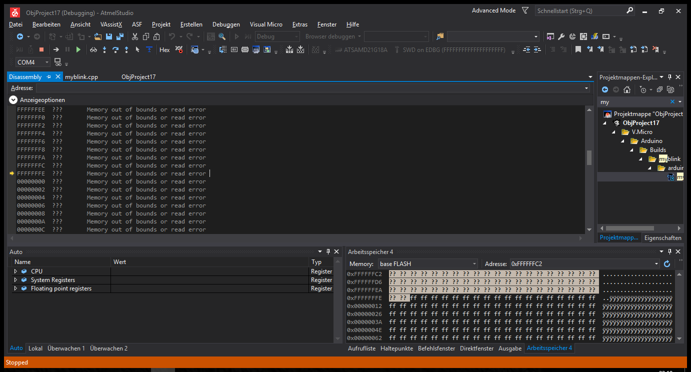 Guten Abend, ich verzweifle gerade an meinem neu gekauften Arduino Zero Pro. Um die nackte Funktion zu prüfen habe ich einige Beispielprogramme geladen und laufen lassen. Funktioniert hervorragend. Dann bin ich natürlich auch neugierig auf den EDBG Debugger. Lasse ich Beispielsweise das Blink Programm zum Debuggen laufen hängt sich der Controller auf. Das Fenster "Disassembly" öffnet sich und offenbart mir folgende Fehlermeldung: FFFFFFFE ??? Memory out of bounds or read error Davon gibt es einige hundert Zeilen. Bei dieser Zeile aber bleibt es stehen. Ich bin jetzt ziemlich Ratlos. Kann mir jemand erklären was es damit auf sich hat?