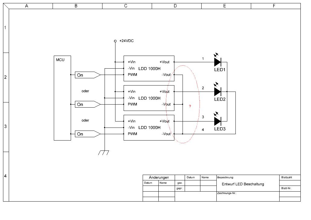 Hallo, ich habe eine dreifarbige LED - Lampe (eine LED pro Farbe, Adern 1,2 und 3), welche über ein 4-adriges Kabel angeschlossen ist. Dabei liegt nun der Minuspol der LEDs auf der gemeinsamen Ader 4. Es soll nun immer genau eine LED leuchten, niemals zwei/drei gleichzeitig, was ich über einen MC steuern würde. Kann ich in diesem Fall die -Vout - Anschlüsse der LDD-1000H KSQ gemeinsam anschließen? Danke und viele Grüße->robbeh
