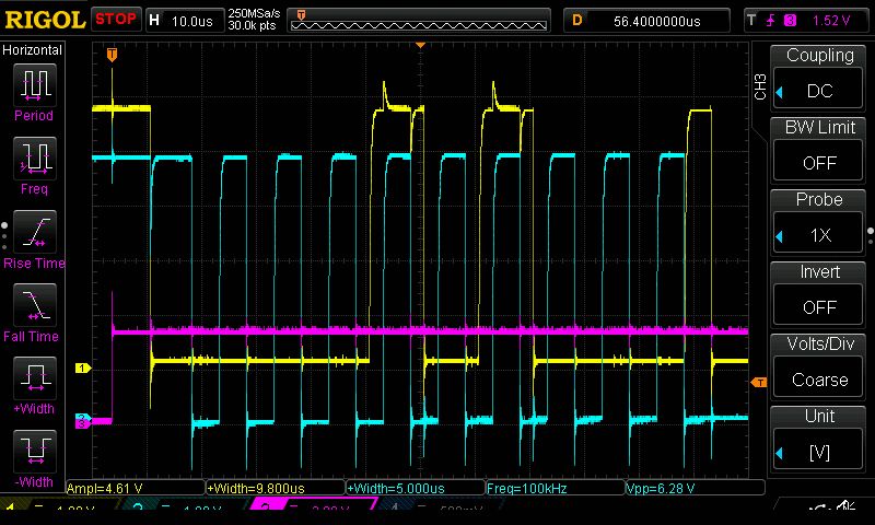 TK schrieb: > Jetzt spekuliere ich mal: > Der Sensor liest die SDA-Pegel bei einer fallenden SCL Flanke ein. das vermute ich auch, deshalb hatte ich diese Zeiten genauer angesehen. Nur der L031 hält die Daten nur 250 ns, der F407 400 ns und funtktioniert trotzdem schlechter. Der F407 hat keine Einstellmöglichkeiten für das Timing, andere (neuere?) cores lassen sich genau hier mit SCLDEL / SDADEL in setup und hold time beeinflussen. Aufbau siehe Bild, Tastköpfe sind auf 10x eingestellt, Fehler gibt es auch ohne. Mit dem gleichen Breadboardaufbau am STM32L031 oder LPC funktioniert der Sensor. Ich habe jetzt noch PCA9306D Levelshifter bestellt, so schlecht sieht mir das Timing nicht aus, da bleiben ja nur noch die Pegel.