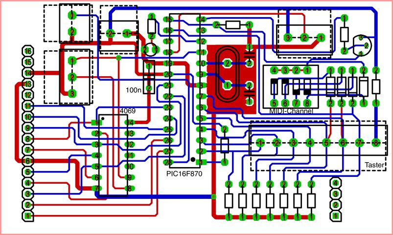 U. M. schrieb: > Da hast du noch ein sehr laienhaftes Verständnis für die > EMV-Problematik. Yep, das ist nicht abzustreiten ;-) Darum bitte ich hier ja um Hilfe. Diese Projekt ist mein erstes, bei dem ich eine digitale Schaltng einigermaßen richtig aufbauen möchte, da sie fest in ein Gerät verbaut werden soll. Bislang war ich eigentlich nur in der Analogwelt unterwegs. Zumindest von der praktischen Seite her. Im Anhang mal das komplette Layout. Die Schaltung macht nichts besonders. MIDI kommt über UART rein (mit 32kHz Takt) und je nach MIDI-Programm-Nr. werden über den PIC16F870 bestimmte Relais geschaltet. Zusätzlich gibt es noch ein paar Tastereingänge für Bedienung ohne MIDI. Wie weit kann ich diesen PIC eigentlich runtertakten? Ich denke mal für diesen Zweck muss der womöglich nicht mal mit 4MHz laufen. Anja schrieb: > Ich würde noch 1-10nF an den Reset-Pin (gegen Masse) hängen. > Außerdem noch einen kleinen Elko parallel zum Abblockkondensator links. Das ist ja das kleine Problem, da noch zwei Kondensatoren reinzubauen. Wie groß sollte der Elko sein. 1µ? 10µ?
