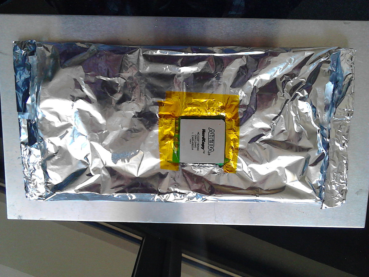 @Andreas: Ja, sieht so aus - ich denke, die 8400 reicht mir hier. Trotzdem Dank für das Angebot :-) @Jens: ja, für eine dauerhafte Lösung muss der Chip sicherlich aktiv gekühlt werden. Da überlege ich mir gerade etwas in der Art: http://www.theneighborhoodnerd.net/syncmaster-305-gateway-xhd3000-repair-cooling-mod/ Sieht halt nicht wirklich schön aus - eine passendes dickes Kupferblech mit Radiallüfter an einer passenden Stelle im Gehäuse (genug Platz wäre unter der SNT-Abdeckung vorhanden) würde auch den Rest noch mitkühlen, ohne groß Geräusche zu fabrizieren. Wobei die SNT-Platine noch gut aussieht - keine verdächtigen Elkos und die Spannungen sind soweit sauber und ripplefrei. Aber zum Wichtigsten: das "Reflowing" hat offenbar funktioniert! :-) Da ich die Platine wegen der beidseitigen Bestückung nicht per Dampfphase löten wollte, musste ich improvisieren und habe unseren nicht mehr genutzten Einbauherd zweckentfremdet. Der wurde mittels einer Testplatine und bleifreien Lotaugen bei Heissluft so eingestellt, dass das Zinn gerade so schmolz. Die Platine wurde mit Alufolie so weit wie möglich vor der Heissluft geschützt und am BGA dann mit Kapton-Tape (3D-Drucker sei Dank :-) abgeklebt. Dann ab in den aufgeheizten Ofen, für 7 Minuten backen und danach langsam abkühlen lassen - eingebaut, eingeschaltet - perfektes Bild auch nach jetzt vier Stunden Dauerbetrieb. Ich hoffe mal, dass es so bleibt und suche nun die beste Kühlmöglichkeit. Auf einem Bild sieht man oben auch das Schirmblech mit dem dicken, grauen Kunststoff/Silikonpad, das auf dem Altera saß. Wie schon geschrieben: kein Wunder, dass die reihenweise ausfielen. FreeCAD auf 30 Zoll hat schon etwas - endlich ist mal Platz für die Icons :-)