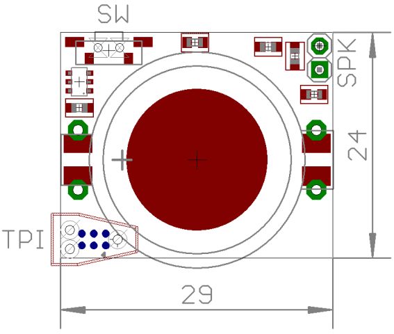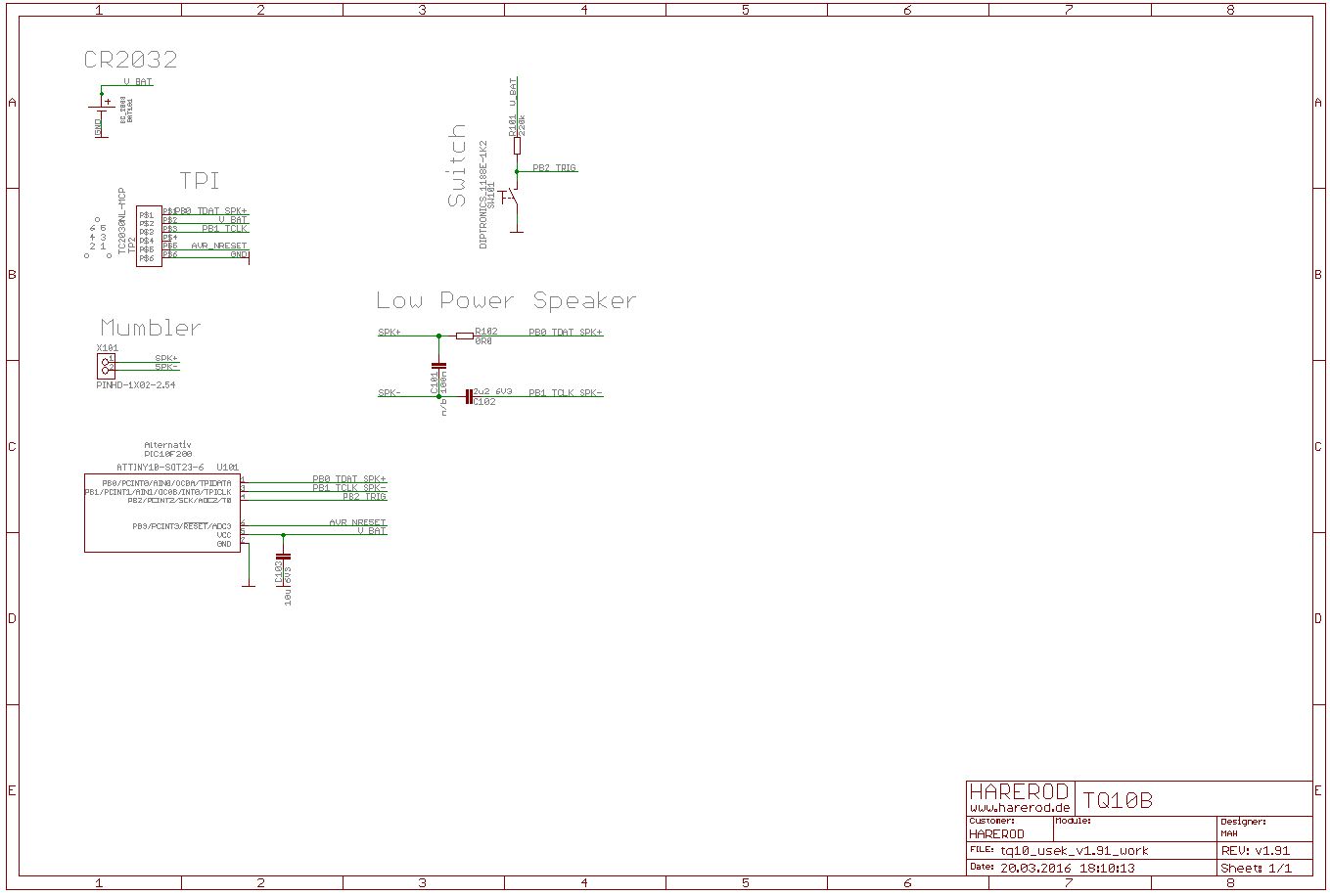 Sooo, im Anhang ein Schaltungsvorschlag für einen tastengesteuerten Quäker. Die Platine ist mit 29mm x 24mm um einen CR2032 Knopfzellenhalter aufgebaut. Die CR2032 wird mit 220mAh angenommen. Der Lautsprecher wird über optionale Filter im Gegentakt betrieben, um auch das letzte Milliwatt aus den Endstufen zu pressen. Der SMD-Taster kann wahlweise auch durch einen Sensor ersetzt werden. Der R101 ermöglicht den Verzicht auf die eingebauten Pullups. Im Einstiegsmodell werkelt ein PIC10F200 mit 1MIPS. Hier sind Standby-Ströme im Bereich von 1µA zu erreichen. Für Poweruser steht eine Hochleistungsvariante mit ATtiny9 zur Verfügung. Dieser Bolide geht mit nominal 9,6MIPS ins Rennen. Bezahlt wird dies jedoch mit 50% Mehrkosten für die MCU (0,67€ statt 0,48€) und einem erhöhten Standby-Stromverbrauch von ca. 2µA. Programmiert wird die Baugruppe über TagConnect TC2030NL kompatible Pads, so dass hier in der Großserienfertigung keine Zusatzkosten entstehen. Für beide MCUs stehen zahlreiche freie Programmierwerkzeuge zur Verfügung. Sei es Assembler für den sportlichen Enthusiasten, über C-Compiler für den routinierten Profi, bis zur Arduino-Sketch* für den ambitionierten Einsteiger. Grüße, Marcus * für Arduino-Sketch ist ein ATtiny10 erforderlich. Die Hardware-Zusatzkosten gegenüber ATtiny9 belaufen sich auf ca. 50%.