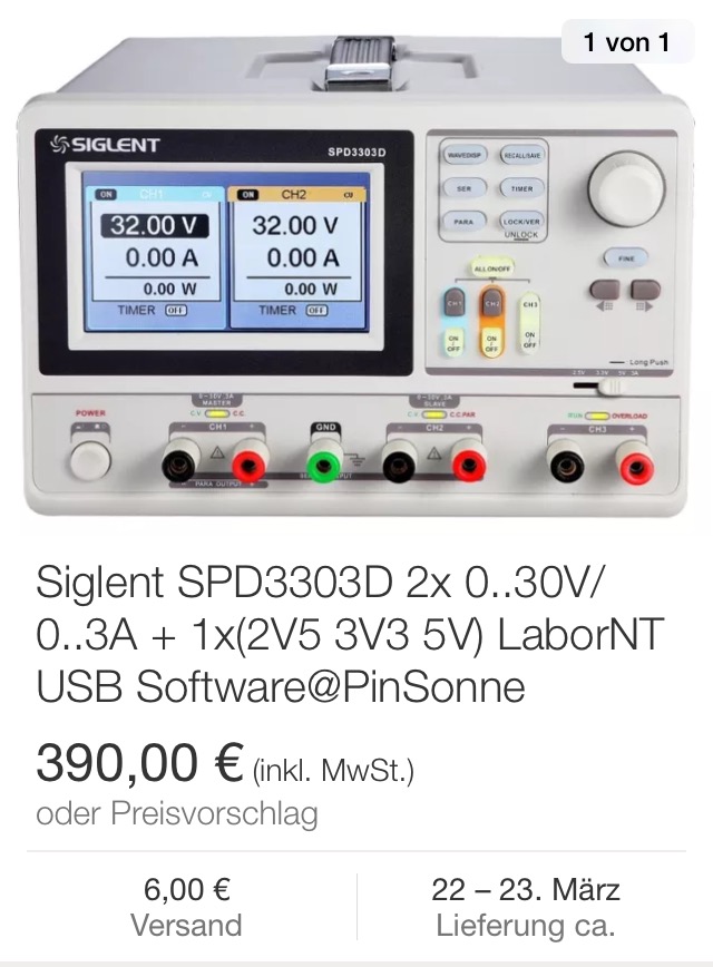Hallo, ich brauche ein Labornetzteil. Mein Budget liegt so in etwa bei 500€. Kann mir jemand paar Modelle empfehlen? Bisher bin ich nur auf die Rigol Labornetzteile aufmerksam geworden. 2 Getrennte Kanäle wären schon gut. Spannungsbereich 0-30V und für den maximalen Strom wären 2-3A toll. Bin auf eure Empfehlungen gespannt. Grüße Thomas