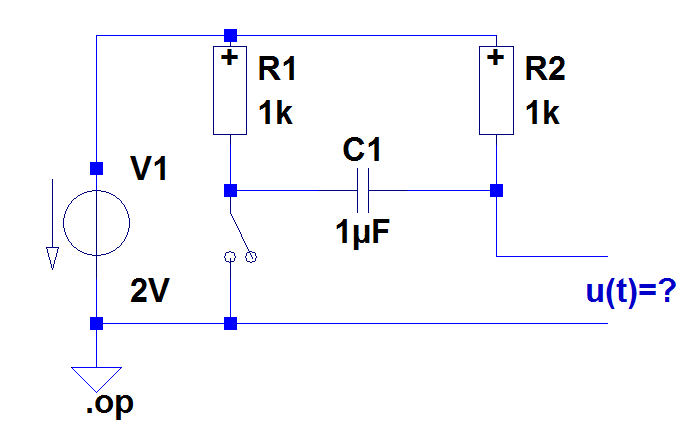 Wenn ich den Schalter schließe, lädt sich der Kondensator über 1kOhm bis auf die Versorgungsspannung auf. Wenn ich den Schalter öffne, dann entlädt er sich über 2kOhm wieder bis auf 0V. Aber vorsicht: das beschreibt nicht U(t) sondern Uc(t)!