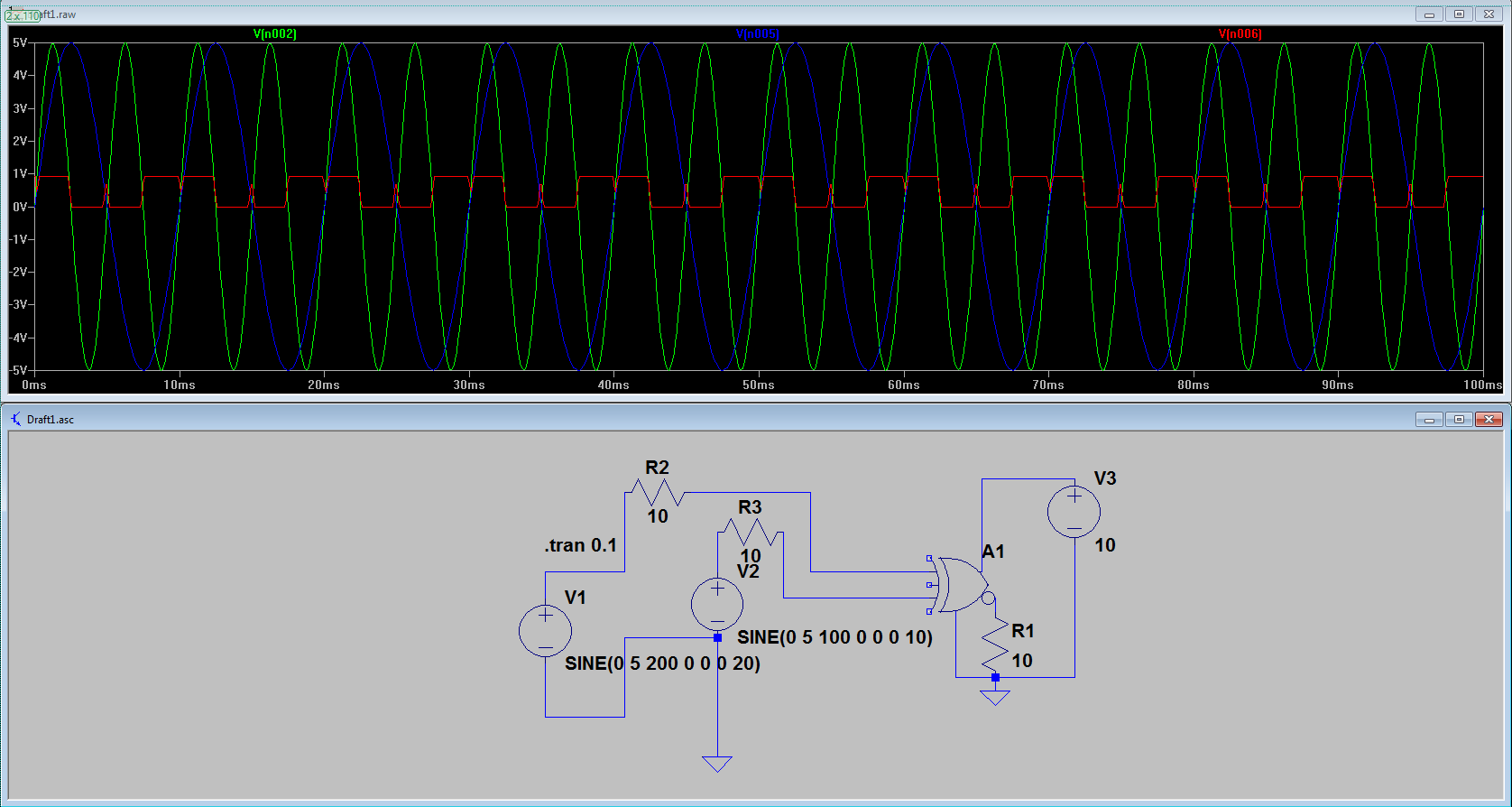 Die Simulation beschönigt noch das Verhalten deiner schlecht überlegten Schaltung! Ich möchte mir das Überschwinger- Geprassel einer realen Schaltung garnicht ansehen!!! Wenn du schon an Analogbausteinen sparen willst, schick die Analogsignale erst mal durch ein Schmitt-Gatter. Den Versatz Logik-Schwelle gegen Nulldurchgang (oder 50%-Durchgang) wirst du aber weiterhin haben... Was ist das eigentlich für ein merkwürdigstes XOR-Gatter? V+ an Q und 10 Ohm an Q-Nicht??? Oder wie? Hm, vielleicht bin ich zu altmodisch und kenne noch keine Analog-XORs. ;-)