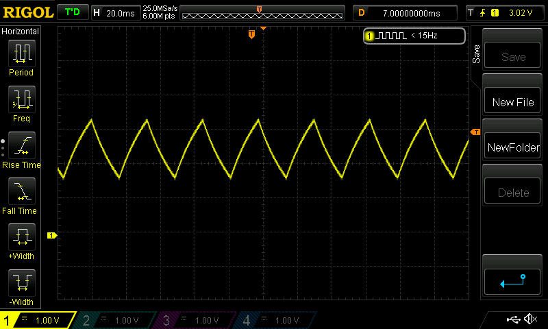 Da kommt ein Dreiecksignal raus?! Hast du das mit dem Oszi gemessen? Häng da mal nen Bild an bitte.