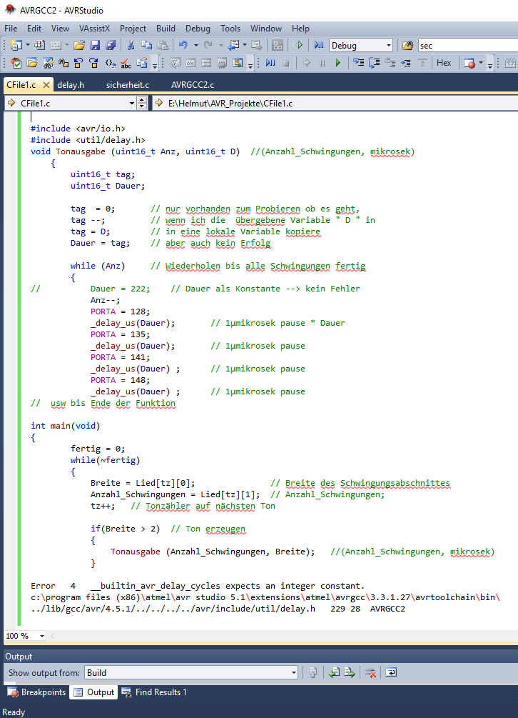 Hallo Wie kann ich während der Laufzeit der Funktion _delay_us Werte übergeben? Diese Werte ändern sich mit der Laufzeit des Programmes und werden aus einem Array [30][2] ausgelesen? Text der Fehlermeldung: __builtin_avr_delay_cycles expects an integer constant. Im Anhang der Programmauszug.