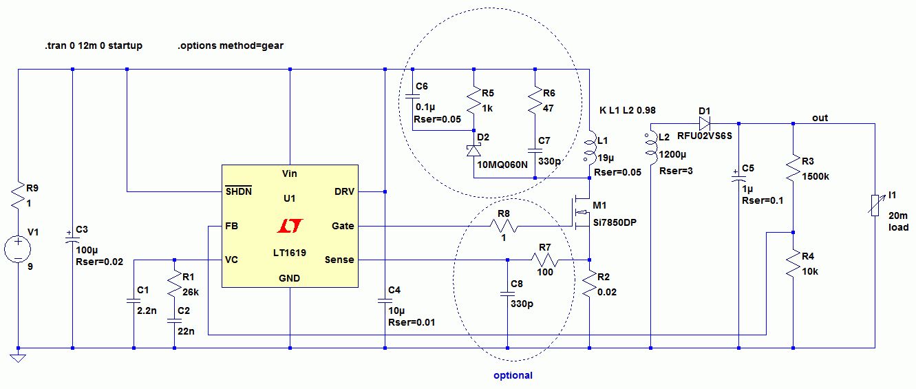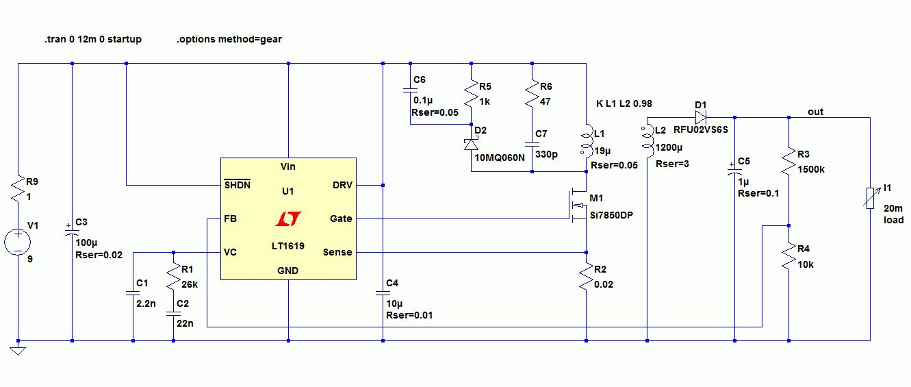 Ich habe ein Schema in LT Spice nachgezeichnet, und wollte dann simulieren. Ich möchte mit einm Flyback-Trafo (1:8, primär 18uH) eine Spannung von ca 180V mit 20mA Strom realisieren. Hierzu habe ich den LT1619 hergenommen. http://cds.linear.com/docs/en/datasheet/1619fa.pdf Auf Seite 16 des Datenblatts ist eine Flyback-Schaltung gezeigt, jedoch mit einem anderen Trafo. Das sollte ja aber keine Rolle spielen. Als Mosfet habe ich ein sehr ähnliches verwendet. Meinen Trafo hab ich wie folgt gerechnet L2 = L1*((N2*N2)*(N1*N1)) Ergibt 1219uH für die Sekundärwindung. Nun... Die Simulation liefert ein technisch unmögliches Ergebniss. und zwar 1600V @ 20mA. Bei 12V 1A Input. Kann mir hier jemand sagen wo das Problem ist? Bild und .asc im Anhang