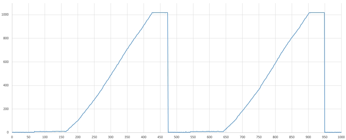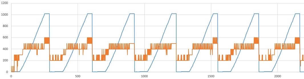 Moin Aus einem Servo wurde die Motorelektronik ausgebaut und es wird von einem µC angesteuert. Es kann und muss nur im Uhrzeigersinn drehen. Damit es sich voll drehen kann, wurde aus dem Getriebe und dem Poti die mechanische Begrenzung entfernt. Das Poti wird am ADC des µC ausgelesen. (siehe Bild) Auf dem Bild sind etwas mehr als zwei volle Umdrehungen abgebildet. Deutlich zu sehen ist, der eigentliche Messbereich des Potis (ca 55%). Dort ist eine Positionierung ja unproblematisch, aber: Wie könnte man die Position im restlichen Bereich (45%) einigermaßen genau erreichen? Eine Umdrehung dauert etwa 3s und es kann keine zusätzliche Hardware eingebaut werden.