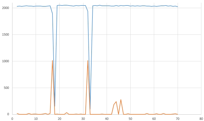 So, jetzt mal die Umlaufzeiten gemessen. Von 70 Messungen liegen 4 außerhalb der Realität. (Blau in ms) Damit sollte sich erstmal arbeiten lassen. In orange der gemessene Spannungswert. Hier wieder der Code, falls es jmd interessiert, oder jmd ne Verbesserung hat.