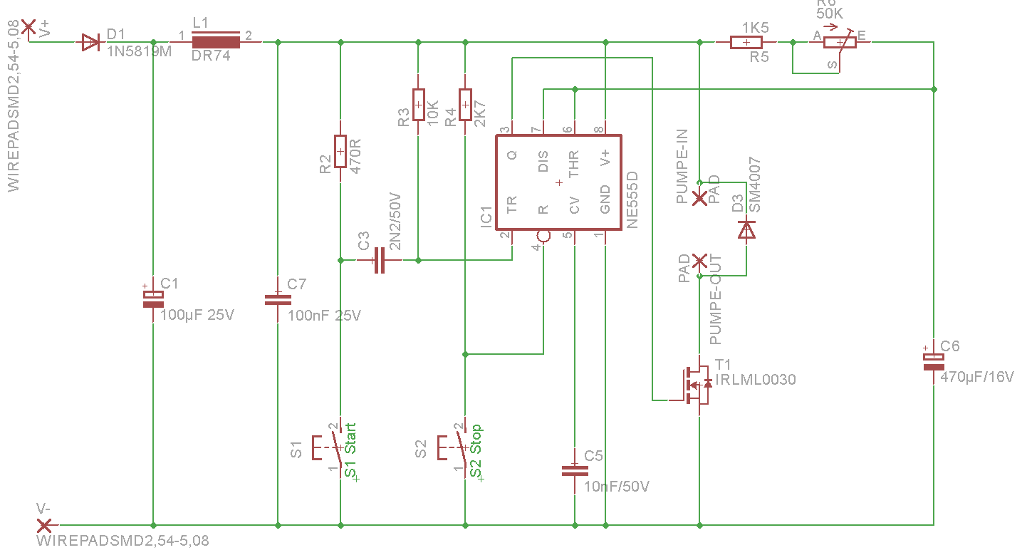 Die Frage ist, ob die 1N5819 den Strom der Pumpe verträgt. Mögl. ist es also besser, die Pumpe noch vor der Diode an die Versorgung anzuschliessen. Michael B. schrieb: > Entscheidender ist, daß man 470uF nur als Elko bekommt, 4.7uF aber als > Folie und Folie ist deutlich präziser, langzeitstabiler und kleinere > Leckströme. Wenn du die CMOS Version des NE555, also den 7555, verbaust, ist das alles sehr viel entspannter, denn dieser Chip hat ein besseres Verhalten mit hochohmigen Widerständen und deswegen kann man von vorneherein kleinere Kondensatoren verwenden. Er liefert zwar auch weniger Ausgangsstrom, aber das spielt bei einem MOSFet als Endstufe keine Rolle.