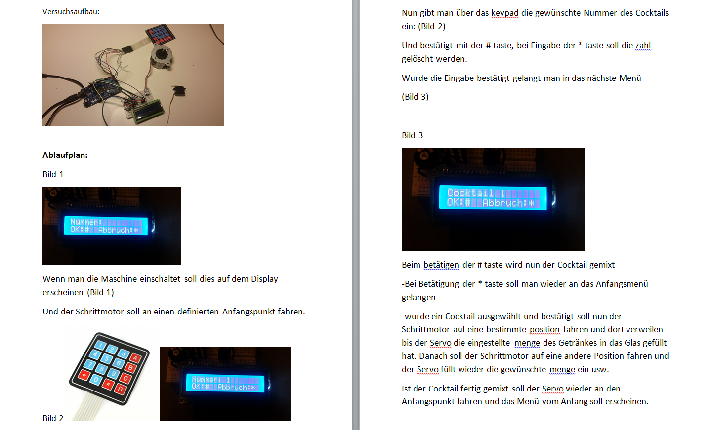 Die Eingabe von der Nummer des Cocktails ist doch das kleinste Problem. Ist das Programm schon soweit fertig, dass ein einzelner Cocktail gemischt wird? Ist die Mechanik schon fertig zum Abfüllen einer einzelnen Substanz? Schick mal Bilder davon