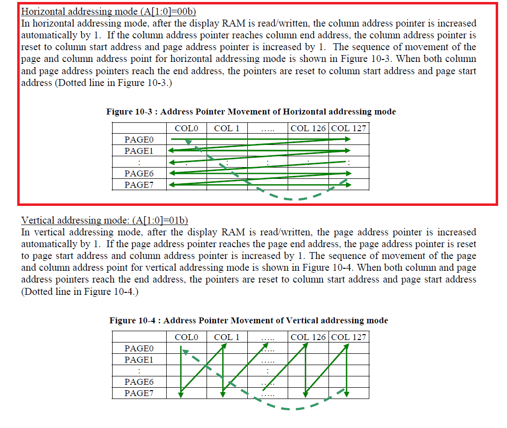 Falk B. schrieb: > Nein, für [64][16]. Ich hab übersehen, daß du 7x12 Zeichen hast. Mein > Beispiel ist für 8x8 Zeichen. Aber das Prinzip bleibt gleich. Ich verwende sowieso unterschiedlich grosse und breite fonts. Dehslab würde ich dort einfach die jeweilige breite auslesen und verwenden. Das mit den [64][16] verwirrt mich jetzt ungemein. mir ist bewusst, dass es schlussendlich auch "nur" 1024bytes sind. Und man damit einfach anderst auf die Daten zugreifen kann. Jedoch erwartet das Display von mir die Bytes momentan wie im Bild im Anhang dargestellt. (rot markierter Bereich) Zuerst also 128Bytes für die erste Page. Dann die nächsten für die zweite usw... Ich sende mommentan mit dem DMA alle 1024Bytes in einem rutsch. Deshalb bin ich nach meine Verständnis an die Pages gebunden oder nicht? Wäre ich eventuell besser dran, wenn ich das DIsplay auf den Vertical Mode umstellen würde? Danke