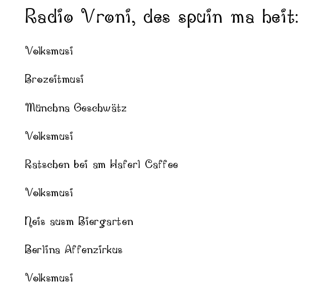 Nachdem der BR seine MW-Sender abgeschaltet hat, sind seit einiger Zeit viele alte Radios quasi heimatlos. In manchen Fällen kann Radio Vroni für Ersatz sorgen, einfach das betroffenene Radio daneben stellen.Damit gibt es auch Bayrisch im Radio, es kann auch eine andere Wellenlänge als 801 Fuß verwendet werden. Als Grundlage der Audiodatei wurde von Wikipedia, Zither, das dortige Klangbeispiel verwendet.