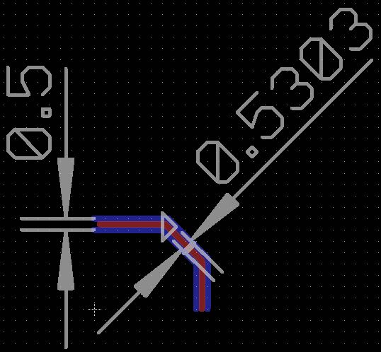 Hi Schorsch, herzlichen Dank für's Anschieben. Ich bin froh, dass der 6% Fehler bisher immer in der Prozesstoleranz verschwunden ist. Ich habe aber tatsächlich praktisch nie mit breiten Bussen zu tun. Und da ich nur mit Gleichspannung (<1GHz) arbeite, gab es auf den kleinen PCBs sogar wellenwiderstandsmäßig noch nie Probleme. Im Anhang das Ganze als Bild graphisch gelöst. Für die Freunde geschlossener Lösungen habe ich mal ein gleichschenkliges Dreieck eingezeichnet. Hypotenuse: 1,5 units Katheten: (1,5 units / sqrt(2) ) ~ 0,5303 units Cooles Tool! Grüße, Marcus