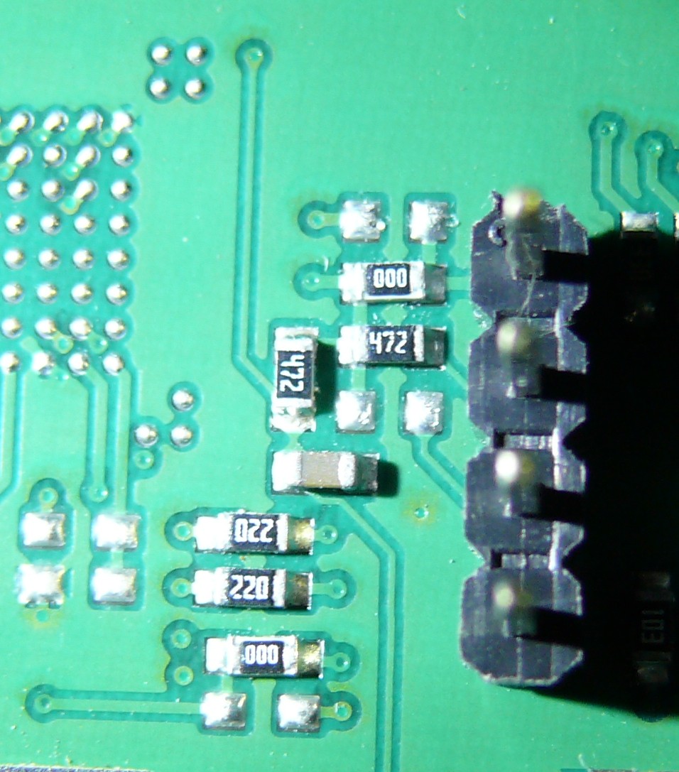 Sebastian R. schrieb: > Die Belegung der Stiftleiste ist (von oben nach > unten): 3V3, RxD, TxD, GND. Wenn deine Belegung korrekt ist, sehe ich da nur ein Pad für einen optionalen Pullup, bei RXD ist dieser (sinnvollerweise) bestückt. Die eigentlichen Datenleitungen sind vermutlich auf der Unterseite der Platine.