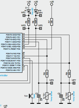 Hallo, ich habe hier ein Schaltungsdetail von einem Funk-Temperaturdifferenz-Sensor HM-WDS30-OT2-SM aus dem ELVjuornal 02/2013 Der Controller nehm ich an ein Atmel mega48 oder 88 o.ä., da die pinbelegung identisch ist. Aber es geht eigentlich um die Beschaltung mit den beiden Sensoren. Warum oder welchen Zweck ist die Verbindung von PD1 mit PC2 ? PC3 ist dann der Messeingang ? Hoffenlich könnt ihr mir weiter helfen.