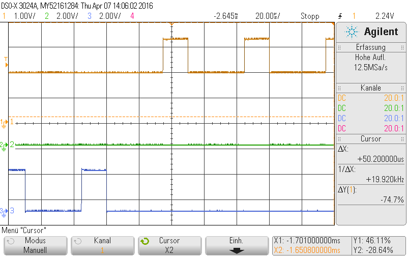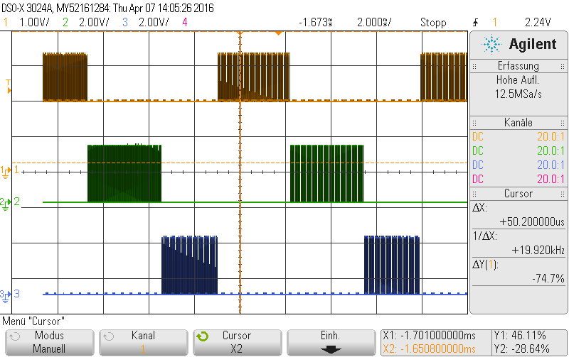Hallo Freunde, ich sitze seit einiger Zeit an dem Programmcode zur Erzeugung einer 3-Phasen PWM mittels des STM32F103 Mikrocontroller. Die Bedingung ist, dass die 3 Kanäle versetzt eingeschaltet werden. Allerdings komme ich ab diesem Punkt nicht weiter. Es ist zwar so, dass jeweils nur ein Kanal aktiv ist, jedoch pulsiert das Signal eines Kanals. Ich brauche eure Hilfe beim Programmcode, da ich nicht so der Meisterprogrammierer bin ;-) Im Anhang habe ich ein Bild der Schleife des Programmcodes abgelegt. Zusätzlich noch zwei Oszilloskop Bilder. Diese zeigen einmal alle drei Kanäle gleichzeitig und einmal mit kleinerer Zeitbasis den einzelnen Kanal 1 und die zugehörige gewünschte Frequenz und Periodendauer. Ich arbeite an diesem Thema für meine Studienarbeit und bin langsam am Ende ich brauche eure Hilfe! Danke im Vorraus für eure Antworten Mfg