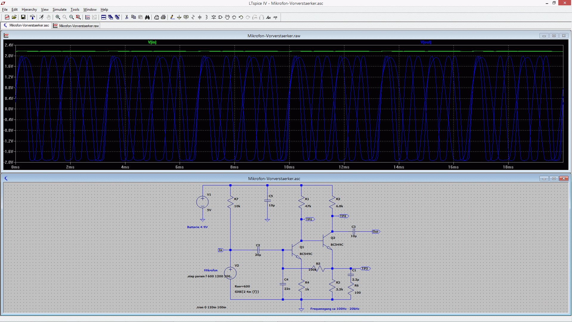 Danke für eure Tips, ich werde dan am Wochenende ausprobieren: - Rauschen überprüfen, ggf. andere Transistoren versuchen - C1 und eventuell auch C2 verkleinern, damit tiefe Frequenzen abgeschwächt werden. - Einen Kondensator einfügen, um hohe Frequenzen abzuschwächen. Ich versuche es mal an der Basis von T1 nach GND. Kondensatoren zum Stabilisieren der Stromversorgung habe ich schon, die habe ich nur in der Simulation weg gelassen. R1 möchte ich nicht verringern, weil sonst die Spannung am Mikrofon auf über 3V ansteigt und im Katalog stand, dass es für 1-3V vorgesehen ist. > Und schließlich hat die Schaltung eine ganz schlechte > Betriebsspannungsunterdrückung Ja, das ist mir bewusst. Die Stromversorgung findet über Batterien statt, sonst gibt es keine anderen Verbraucher, die stören könnten. Ich denke, ein paar Kondensatoren genügen daher. Eine Frage zum Rauschen von R4: Kann man ohne großartige Klimmzüge etwas tun, um dessen Rauschen zu minimieren?Macht es einen wesentlichen Unterschied, ob R4 ein Kohleschicht oder ein Mettallschicht Widerstand ist? > Bleib aber bei NPN! Warum? Spricht etwas dagegen, die ganze Schaltugn spiegelverkehrt mit PNP aufzubauen, oder gar gemischt NPN und PNP zu verwenden? > Wäre ein gewöhnlicher Operationsverstärker besser geeignet, als die beiden Transistoren? Wie sind da eure Erfahrungswerte? (Wobei mich in diesem Fall der geringere Ausgangswiderstand des OP-Amp kaum interessiert).
