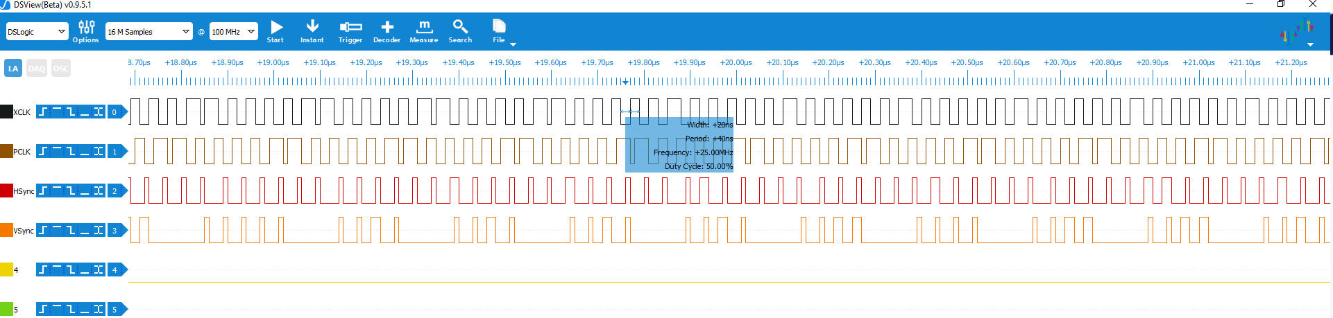 Hallo zusammen, ich habe die Kameramodule vor ein paar Tagen erhalten und will nun in einem ersten Schritt die Bildausgabe per VGA implementieren. Dazu möchte ich das Bild im QVGA Format ausgeben (laut Wikipedia sind das 320x240 Pixel und damit kann ich das komplette Bild im RAM vom FPGA speichern). Die Konfiguration der Kamera mache ich mit einem Mikrocontroller, bis ich den I²C Bus im FPGA implementiert habe. Jetzt habe ich die Kamera heute mal mit einem 25MHz Takt versorgt und HRef und VSync und PCLK an nen LA angeschlossen. Allerdings wird das Ergebnis ein paar Fragen auf (siehe Screenshot). Die Abstände zwischen den HSync (bzw. HRef) bzw. VSync Impulsen müssten doch viel größer sein oder habe ich da einfach nur ein Verständnisproblem? Ich betreibe die Kamera mit den Default-Einstellungen nach dem Power-Up.
