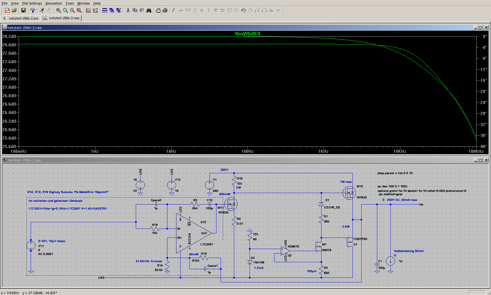 Die aus den Bildern ersichtliche Schaltung stellt den Entwurf für ein rauscharmes Netzteil für 0-250V dar. Bild 1. zeigt den Frequenz- und Phasengang der Ausgangsspannung als Ergebnis der small signal analysis (.ac). Nur steht dieses Ergebnis im krassen Gegensatz zu der transient analysis (.tran). Demnach ergibt sich ein Frequenzgang der neben der Verstärkung von 25 durch OPV und M11 in erster Näherung einem Tiefpass 1. Ordnung mit fg=100KHz entspicht. Siehe die Bilder 2. (-3dB bei 100KHz) und 3. (-23dB bei 1MHz). Dieses Ergebnis steht auch in Einklang mit den Erwartungen. Der 2057 arbeitet etwa mit der Verstärkung V = -1.1 und hat dabei laut Datenblatt eine Grenzfrequenz von ca. 1.3MHz. Die Hauptverstärkung wird also durch M11 bewirkt. Der hauptsächlich die Grenzfrequenz bestimmende Tiefpass wird durch den Ausgangswiderstand des Verstärkers und dem 100µF Kondensator gebildet. Aus der gemessenen fg von 100KHz ergibt sich dieser Widerstand zu 0.016 Ohm, ein durchaus plausibles Ergebnis angesichts der hohen Gesamtschleifenverstärkung. Was also läuft da bei .ac schief? Vereinfachungen, wie etwa der Ersatz des subcircuit "upv-ps" durch eine Spannungsquelle bringt gar kein Ergebnis, dann läuft sich LTspice in seiner damped transient analysis vollends tot und kommt zu keinem Ergebnis. Auch .ic hat bis jetzt noch nichts erbracht. Merkwürdigerweise arbeitet LTspice bei einer verwandten Schaltung, nämlich bei einem gleich aufgebauten Netzteil für 0 bis 25V, bei dem lediglich die Verstärkerstufe mit M11 fehlt, richtig. Anbei auch die .asc und .asy Files für den, der selber mal probieren will. Hier müssen aber die Dateipfade in den .asy entsprechend der Abspeicherung auf dem lokalen Rechner angepasst werden. Gruß Dieter