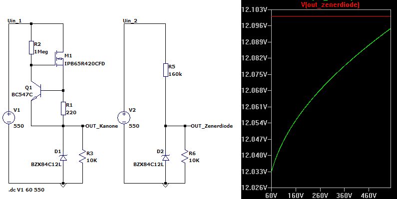 Krangel schrieb: > wenn man mit Kanonen auf Spatzen schießt, sollte man auch treffen. Bei > dem großen Unterschied zwischen Eingangs- und Zenerspannung ist ein > einfacher Widerstand nicht ganz schlecht. Krangel, du hast hier nicht getroffen, denn hier geht es darum die Versorgung des OPV nicht nur bei Oberspannung 550V zu gewährleisten, sondern eben auch noch bei 20V oder so, damit der OPV-Teil auch da noch funktionsfähig ist und die Ausgangsspannung beim Ein- oder Ausschalten keine Sprünge macht. Mit einem einfachen Vorwiderstand müsste man den bei 20V auf etwa auf 10V/2mA=5k dimensionieren, was bei 550V dann 110mA und 60W macht.
