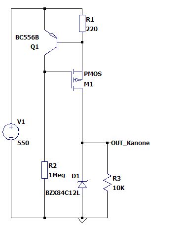 Hi, vielen Dank, habs mal wieder geschafft in PSpice die falschen Signale voneinder abzuziehen :-) So müsse es dann richtig sein, oder? (siehe Anhang) Ich krieg jetzt auf die schnelle die Z-Diode nicht im PSpice zum laufen.... Nur damit ich das jetzt richtig verstehe: * Fall 1: T3 hochhohmig -> UGS von T2 sind ~0.7V, Source von T2 also auf ~100V, oben an R1 kommen etwa 550V raus * Fall 2: T3 "mittelohmig" -> UGS von T2 ist auf 12V, Z-Diode leitet, Source von T2 immernoch auf 100V (Gatespannung wird noch oben gezogen), oben an R1 kommen zwischen 0 und 100V raus * Fall 3: T3 niederohmig -> UGS von T2 ist aus 12V, Z-Diode leitet, Source von T2 auf 100V (Gatespannung wird nach oben gezogen), oben an R1 kommen zwischen 0V raus Durch die Z-Diode verändere ich also nicht die Source-Spannung der Kaskode sondern die Gatespannung wird verändert....richtig? Das heißt, die Z-Diode tut der Schaltung nicht weh... Schorsch