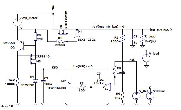 Krangel schrieb: > Beim harten Einschalten der Spannung erzeugt der Rest der Schaltung mit > oder ohne KSQ eine Spitze. Es gibt aber kein hartes Einschalten, weil die Oberspannung aus einem rel. hochohmigen Trafo gewonnen wird und die Aufladung der Glättungselkos ganz sicher nicht in 1ms erledigt ist. Also eher dein 100ms-Anstieg. Und so ganz sauber ist deine Simu auch nicht, weil Vref schon einen erheblichen Wert hat (und damit der OPV eingangsseitig vorgespannt ist), ohne dass überhaupt Versorgungsspannung verfügbar ist. Und bitte keinen IRFP460 für M2/M4, sondern vielleicht einen SPP02N60C5 oder so.