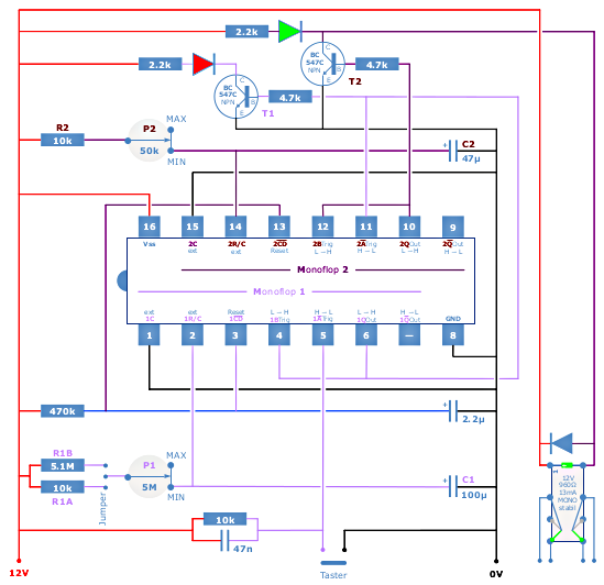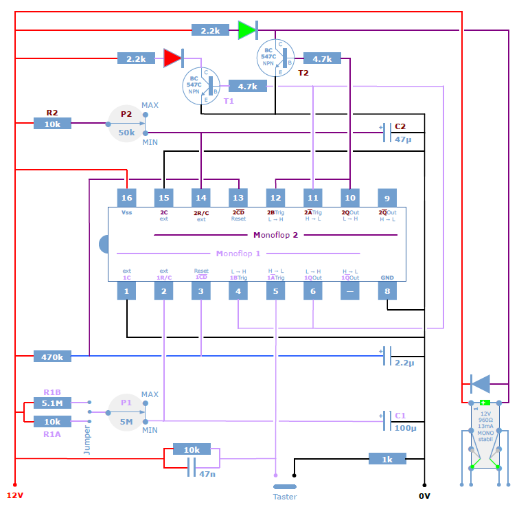 Hallo, die im Schaltplan angegebene Schaltung (Impulsverzögerung [Monoflop 1] + Impulsverlängerung [Monoflop 2]) funktioniert prinzipiell, habe aber dennoch eine Frage zum Schaltungsablauf. Das Zeitintervall der Impulsverlänergung ist 0.5 bis 3 Sekunden. Bei 0.5 Sekunden kann ich nach dem Erlöschen der LED GRÜN die Schaltung direkt wieder mit dem Taster starten mit korrektem Schaltungablauf. Ist die Zeitspanne der Impulsverlängerung länger, beispielsweise 1.5 Sekunden, so passiert folgendes, wenn ich nach dem Erlöschen der LED GRÜN den Taster direkt erneut drücke: Monoflop 1 (Impulsverzögerung) startet nicht und es startet sofort Monoflop 2 (Impulsverlängerung). Warte ich hingegen 2-3 Sekunden mit dem Drücken des Tasters nach dem Erlöschen der LED GRÜN, ist der Schaltungsablauf wieder fehlerfrei. Kann mir jemand erklären, was die Ursache des geschilderten fehlerhaften Schaltungsablaufs sein könnte ? Wenn ja, wie könnte man das Problem beheben ? Vielen Dank im Voraus, Grüße Hans-Werner
