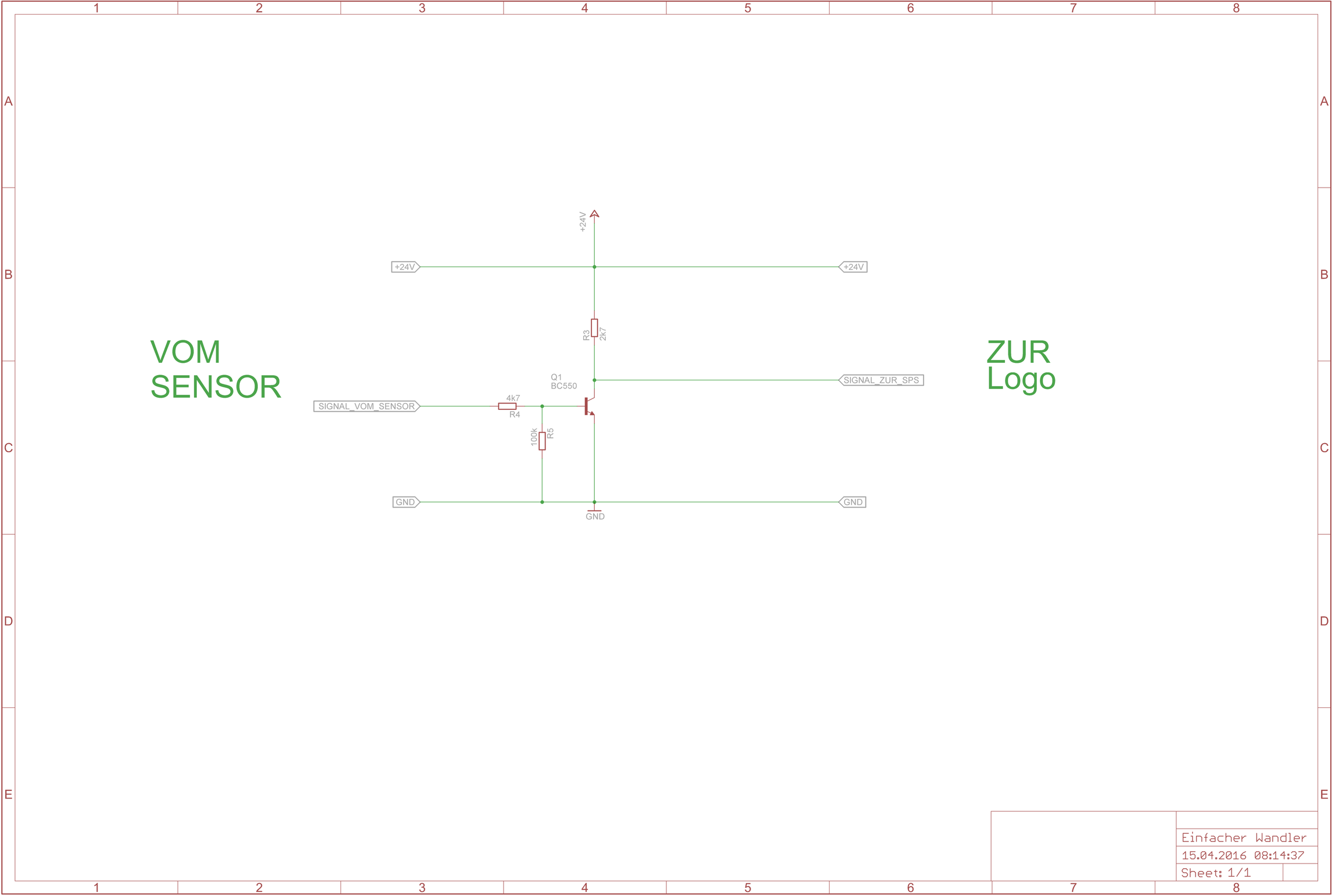 Hallo an Alle. Habe mir so einen Giesomat Sensor besorgt: Beitrag "[V] Bausatz für Giess-o-mat Sensor" Preis und Qualität in Ordnung. Habe anschliesend den Rückkoppelwiderstand getauscht, damit die Frequenz von meiner Kleinsteuerung (Siemens Logo ca.5Khz) angenommen wird. Nun muss noch der Pegel von 5V auf 24V angepasst werden. Kann das so wie im Anhang funktionieren? Da nur ein Rechtecksignal ausgegeben wird, sollte die Invertierung egal sein. Der Pegelwandler wird von der Logo angespeist. Der Sensor wird auch von den 24V versorgt. Der hat ja einen einfachen Linearregler auf 5.6V der Platine. In letzter Zeit wird der Sensor "schwarz" gemacht. Habe aber schon einige seit einem Jahr im Einsatz und hatte da keine Probleme damit. Sind bei mir mit der Masse, welche bei einer Giesharzmuffe dabei war vergossen worden. Nun möchte ich Ihn aber eben an einer Siemens Logo betreiben. Geht die Schaltung so in Ordnung? mfG AllesLogo