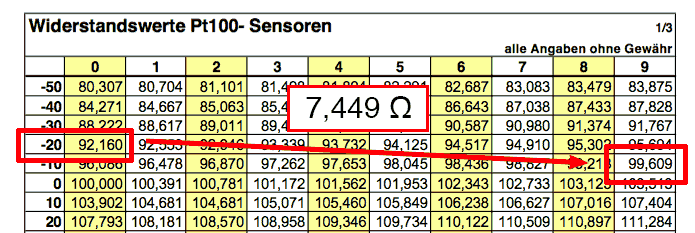 Wladimir schrieb: > also das kabel ist sicher 10meter. Wenn die weisse Leitung einen Widerstand von 7,449Ω hätte, würde das den Fehler (-1°C statt -20°C) erklären.