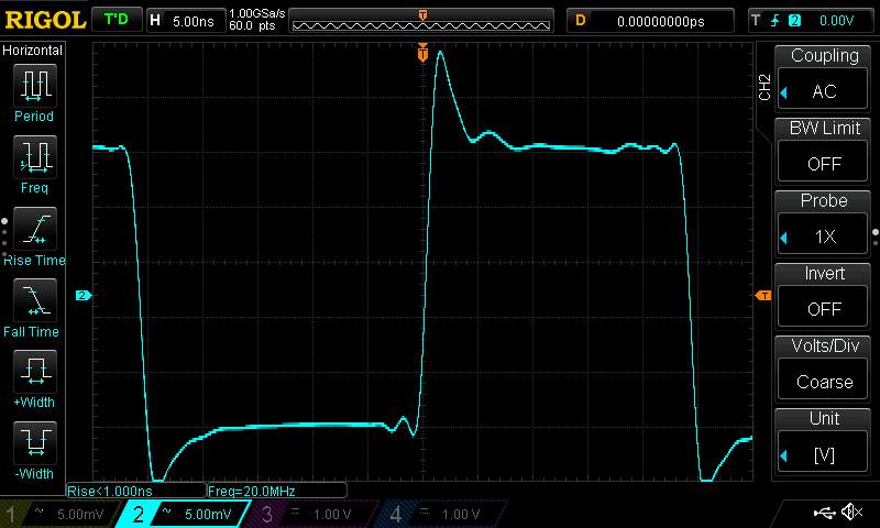 Hi, Habe mir zum Abgleich eines älteren Analogoszis einen kleinen Scopetester gebaut, welcher ein steilflankiges Rechteck mit 25mVpp in 50 Ohm liefert. Der Scopetester wird direkt an das Oszi angesteckt um Störeffekte durch Kabel zu vermeiden. Die Schaltung besteht aus nem kleinen DDS mit einem 74HC14 (alle 6 Inverter parallel, Vdd mit 100nF 0603 abgeblockt) als Ausgangsstufe mit ~6,6 kOhm in die 50 Ohm parallel zum BNC-Stecker (Vdd=3,3V, Vout=25mV). Das Ausgangssignal zeigt allerdings trotz Verzicht auf BNC-Kabel und Beachtung kürzestmöglichster Verbindungen noch Überschwinger. Auf dem Analogoszi sieht man den Überschwinger auch. Wo kann ich hier noch optimieren?