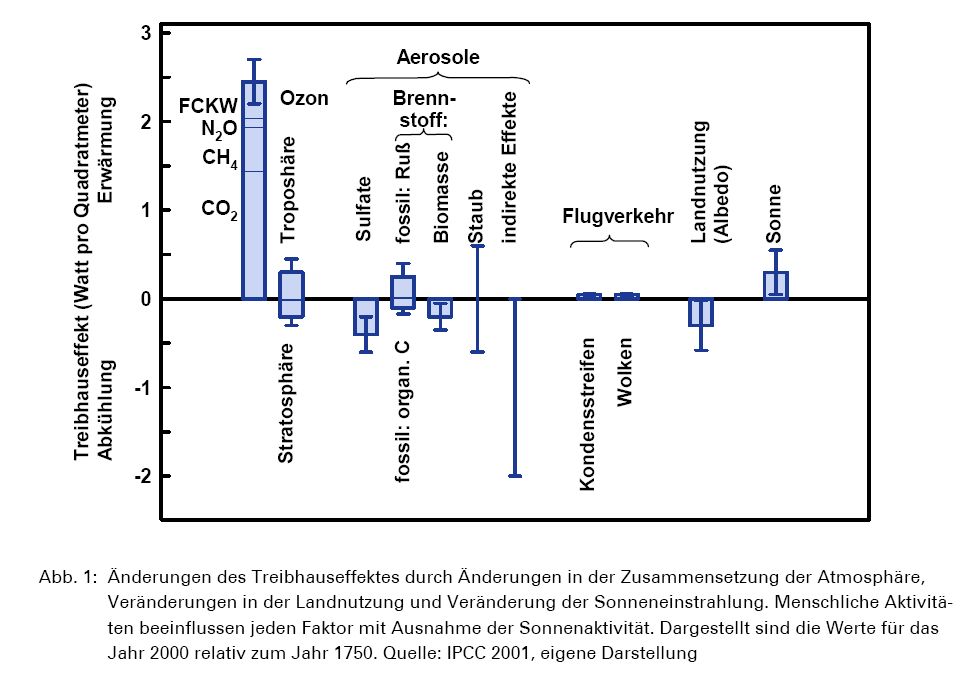 In dieser Aufstellung sieht man in etwa den Einfluss der verschiedenen klimawirksamen Komponenten auf die Erderwärmung. Durch die relative Angabe der Jahre 2000 zu 1750 gehe ich davon aus dass diese Angaben dadurch recht gut den durch menschliche Aktivität verursachten Beitrag wiederspiegelt. Irgendwo hab ich noch bessere Aufschlüsselungen, finds sie aber gerade nicht. ( http://www.bayern.de/lfu/umwberat/data/klima/treibhaus_2004.pdf ) >Glaub keiner Statistik, die du nicht selber gefälscht hast! Es ist der Verdienst der Ökologiebewegung sehr fühzeitig auf die Problemantik der Fossielen Energienutzung hingewiesen zu haben. Es ist aber auch so dass die ebenfalls durch sie wehement vorangetriebenen Idiologiesierung des Themas über weite Strecken eine sachliche Diskussion in der Vergangenheit erschwerte. Mich erinnert so manche aus den 90ern an die Ausernandersetzung mit religoesen Fundamentalisten heute... Wer eine fundiertere Übersicht zum thema Klima wandel sucht kann hier mal reinschauen: Climate Change 2001 The Scientific Basis http://www.grida.no/climate/ipcc_tar/wg1/index.htm Intergovernmental Panel on Climate Change http://www.ipcc.ch/
